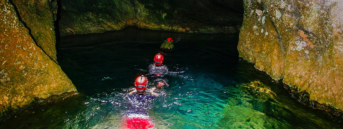 At the entrance of the cave, we must climb down some rocks and then swim into it.