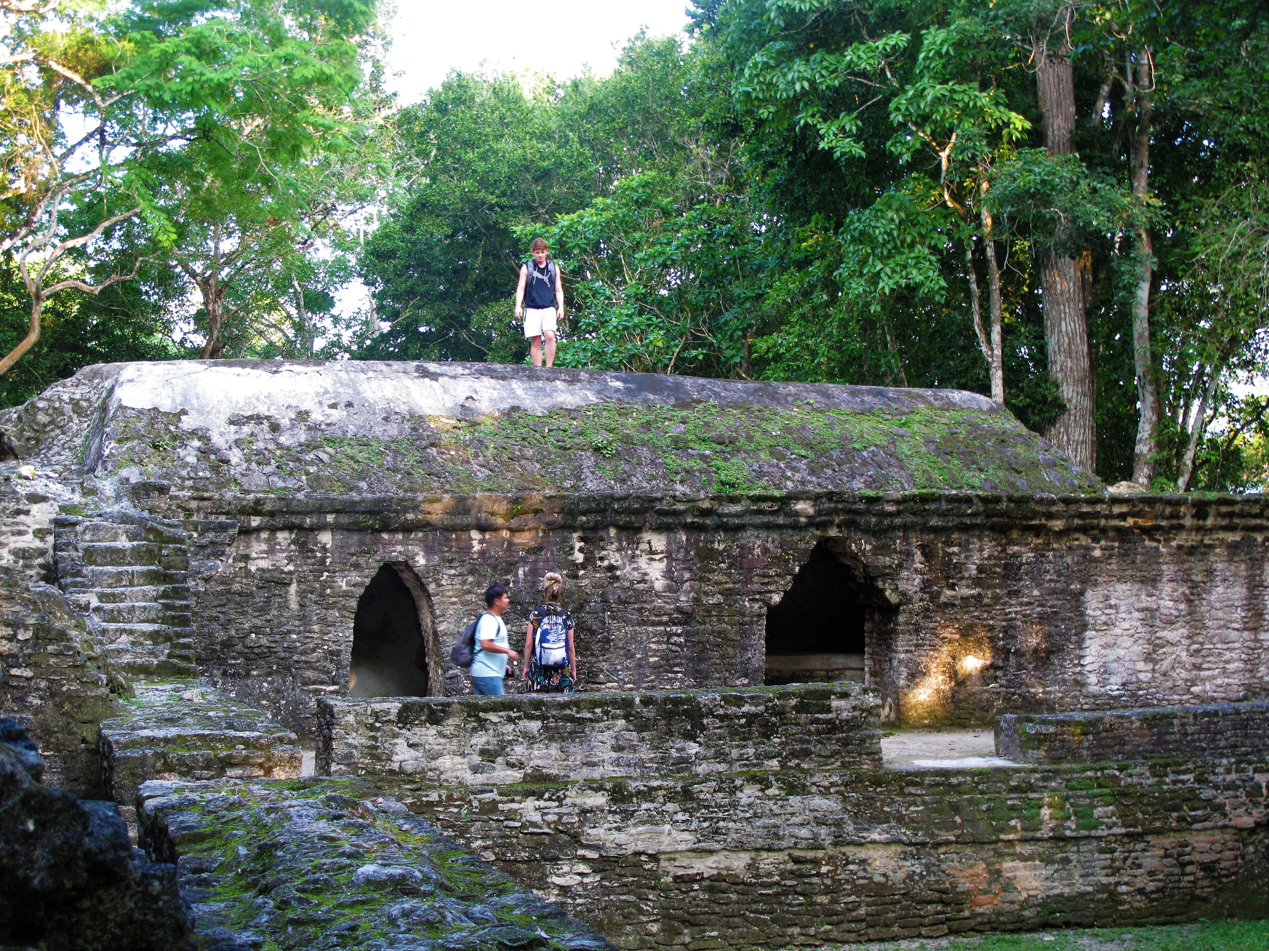 We walk back to the jungle camp to change into dry clothes and we have a lunch of chicken, rice and beans, salad and of course…..rum punch! The tour driver takes us back to San Ignacio and drops us off at the ancient Mayan ruins site, Cahal Pech.