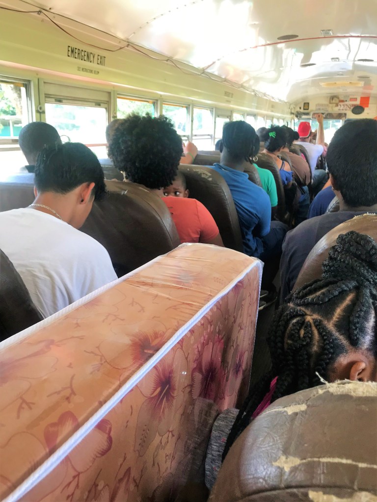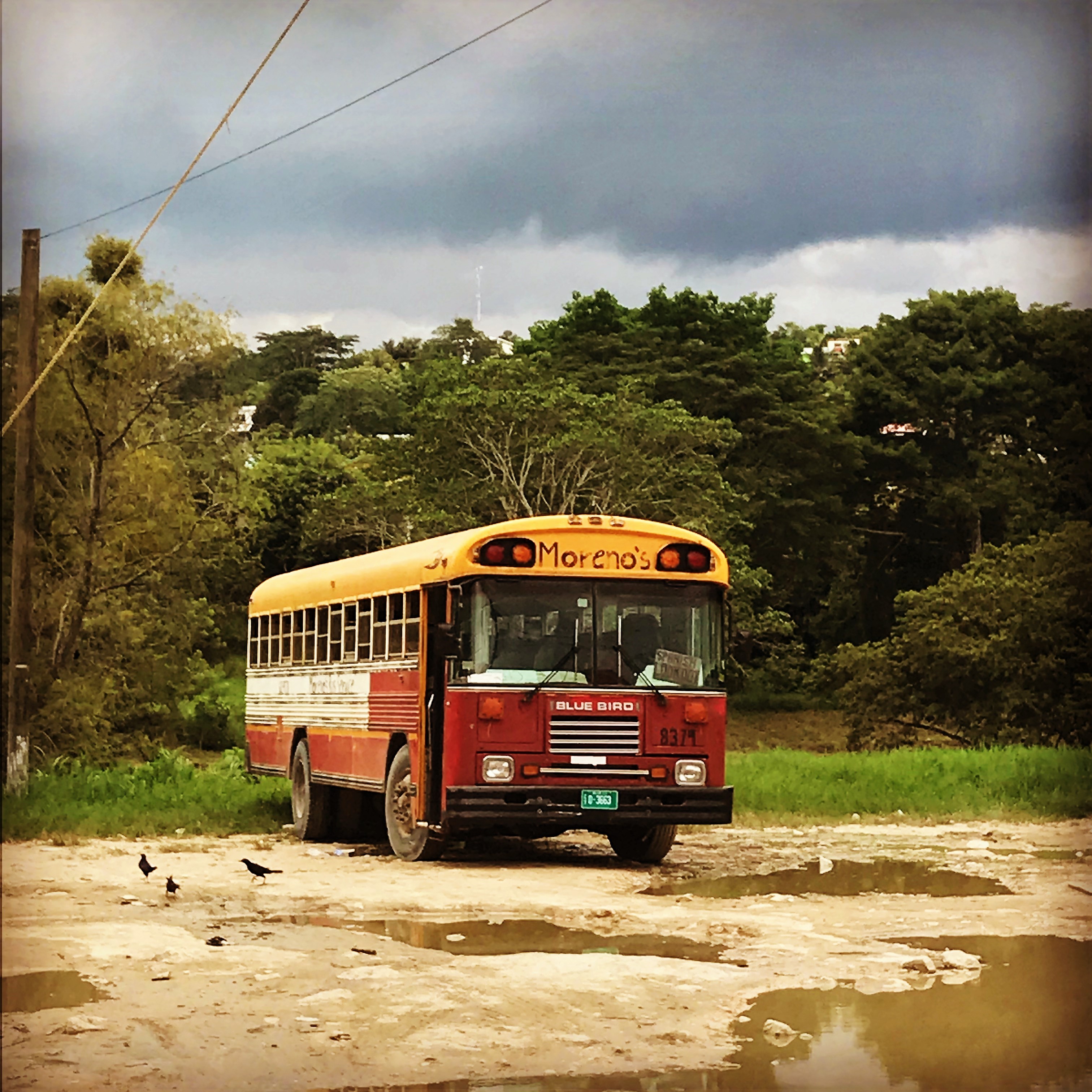 This morning we get back on the speed boat and head to the mainland. We board onto one of those chicken buses again in Belize City and head west. A sweaty hot bumpy ride to the next destination! This bus is more crowded and uncomfortable than the last ones. At one stop, a guy brings a MATTRESS on the bus.