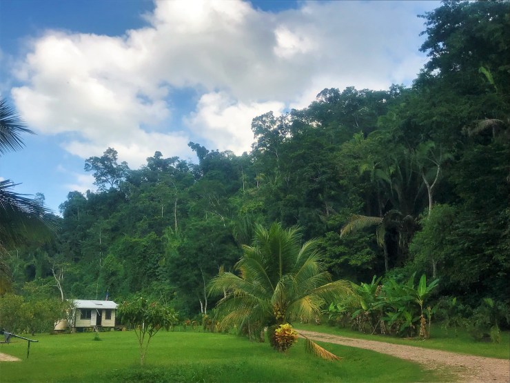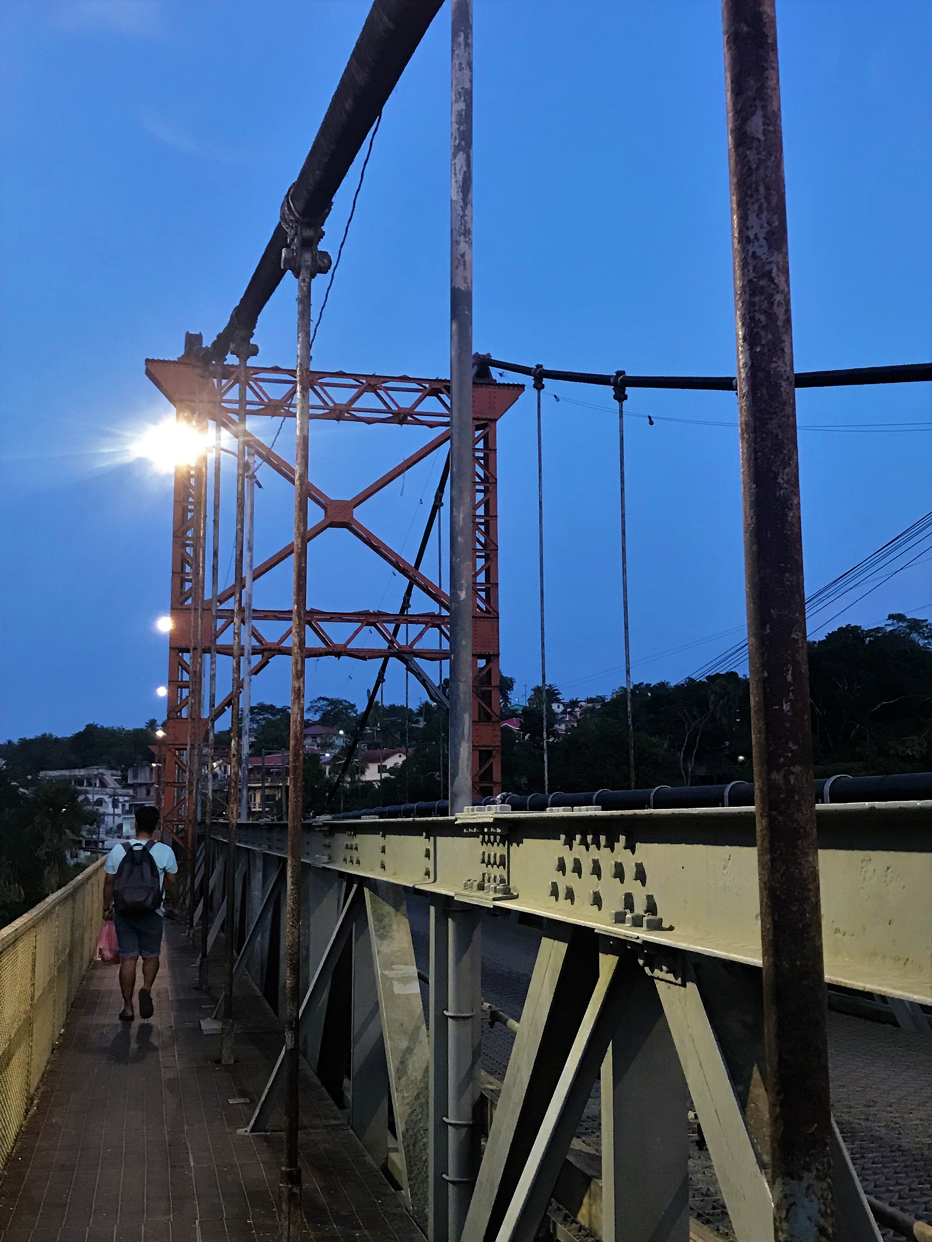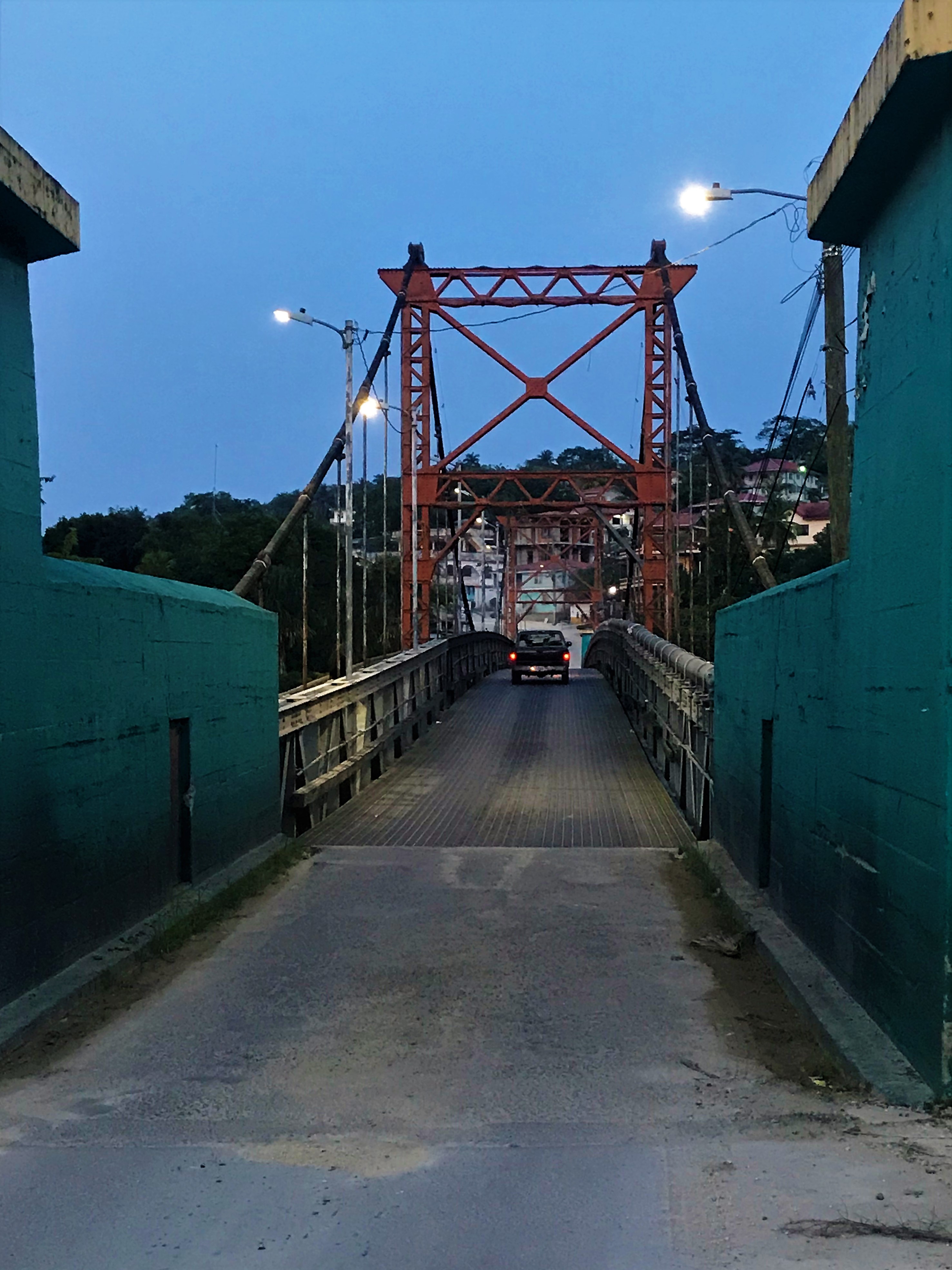 We walk back downhill into the town, past the houses up on the hill. One guy yells out to us…”Hey you want some avocados?” Seriously I can’t make this stuff up! So he proceeds to throw down a bunch of avocados; I am not very good at catching them but I do finally snag one. Now this is the perfect walking home snack – It’s mushy and ripe. Yes! When I arrive back in town, I head over to check out the Hawksworth Bridge, Belize’s only drivable suspension bridge.
