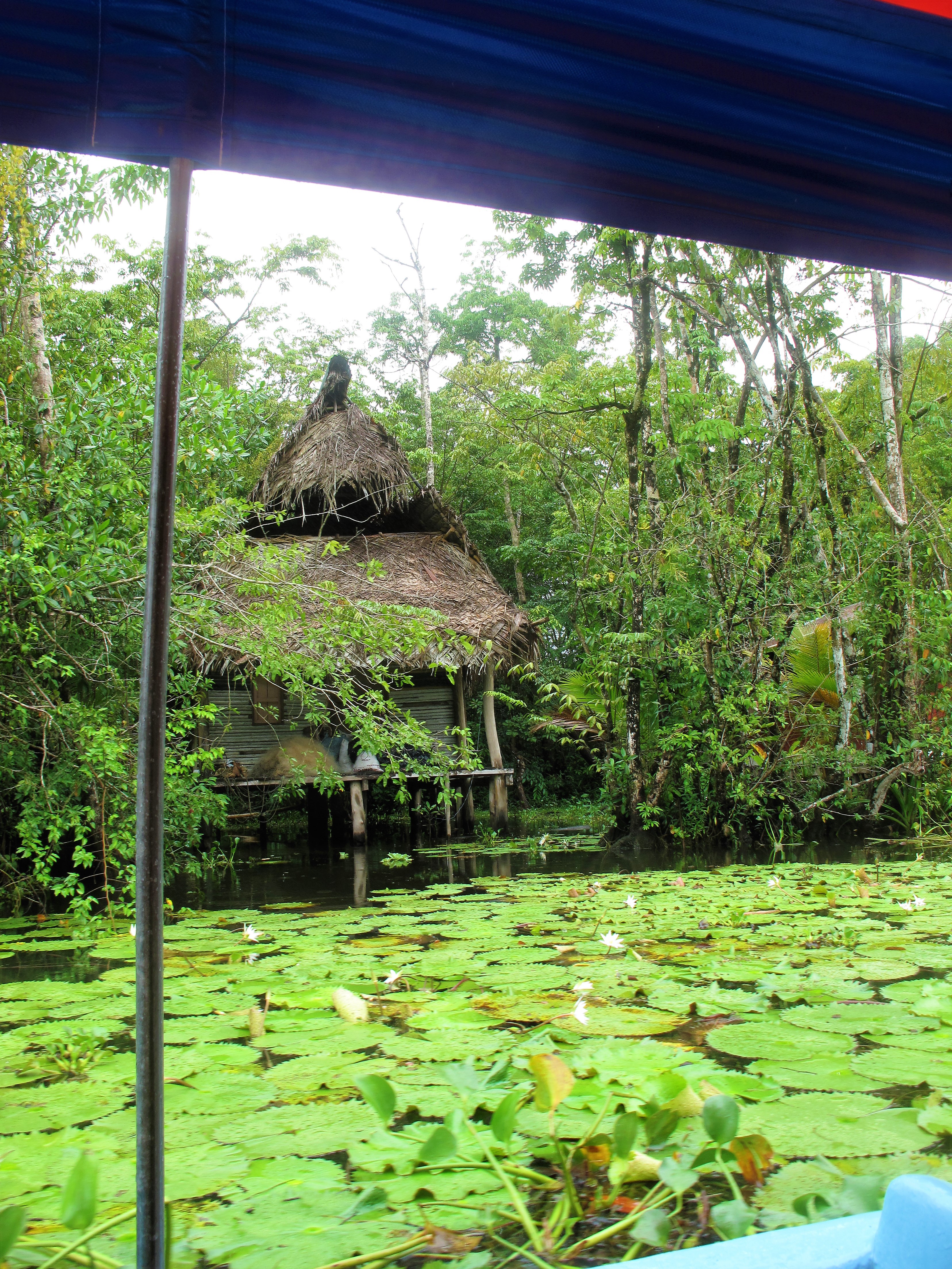 It’s like a jungle cruise! There are stilted houses in the water, and a few locals paddling canoes through the calm river.