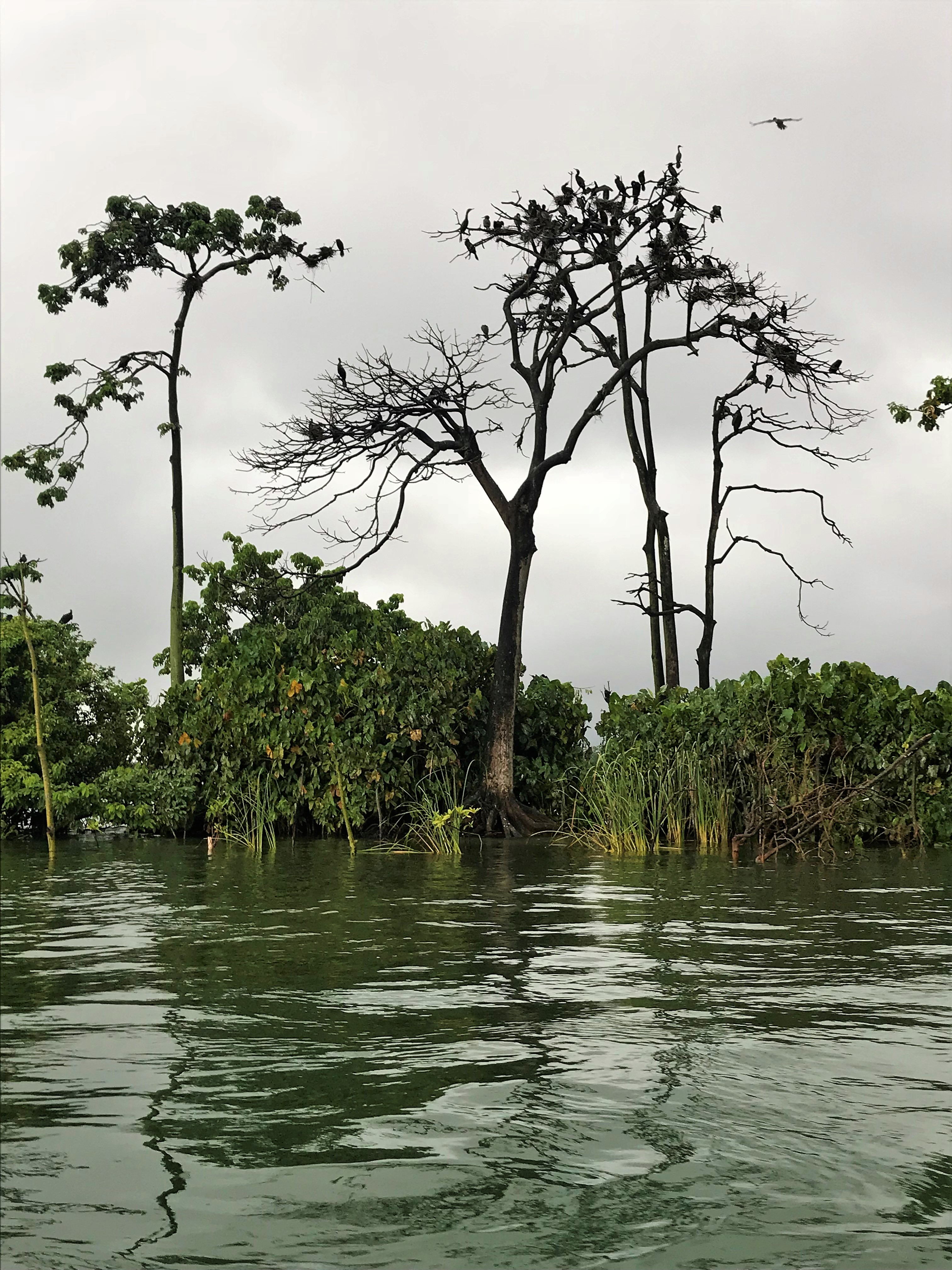 It was meant to stop pirates from entering into the lake. Back in the day this area was an important shipping point. We view it from the boat today, but you can also explore the castle by foot. We turn the boat around and head back in the other direction towards the Caribbean. Along the way we see a small island where there are tons of cormorants and egrets hanging out in the trees.