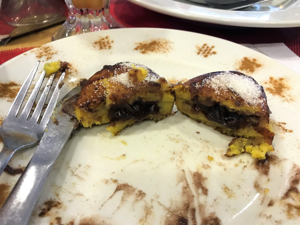 We stop for lunch at a place called Sarita. It reminds me of a Denny’s. The menu offers American style food, as well as Guatemalan. I try the dessert called rellenitos – fried plantains with sweet bean paste inside, topped with sugar. Delicious!