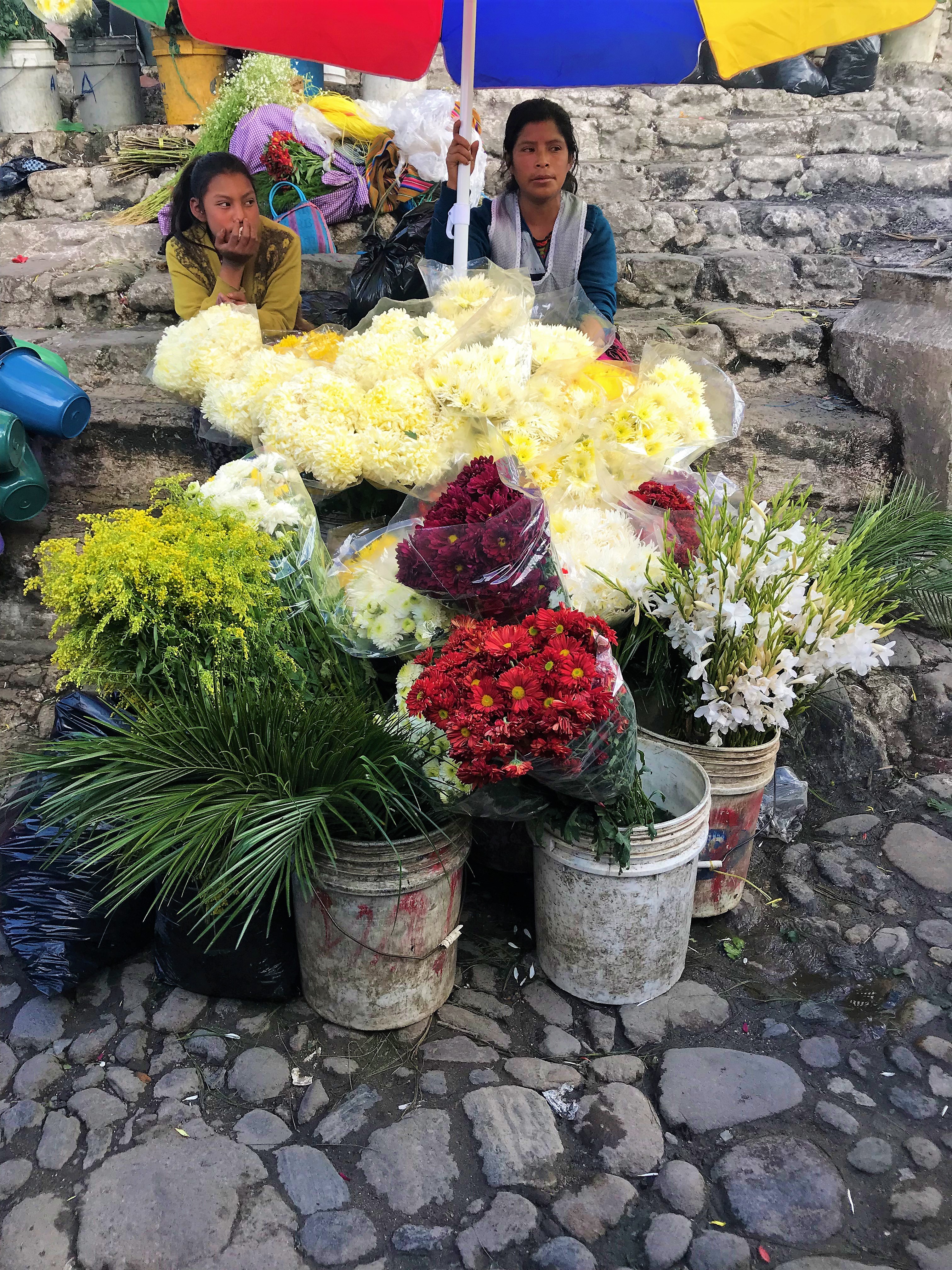 There are 18 steps that lead up to the church up on the platform. Each stand for one month of the Maya calendar year. There are many vendors sitting on the steps with buckets of flowers for sale.