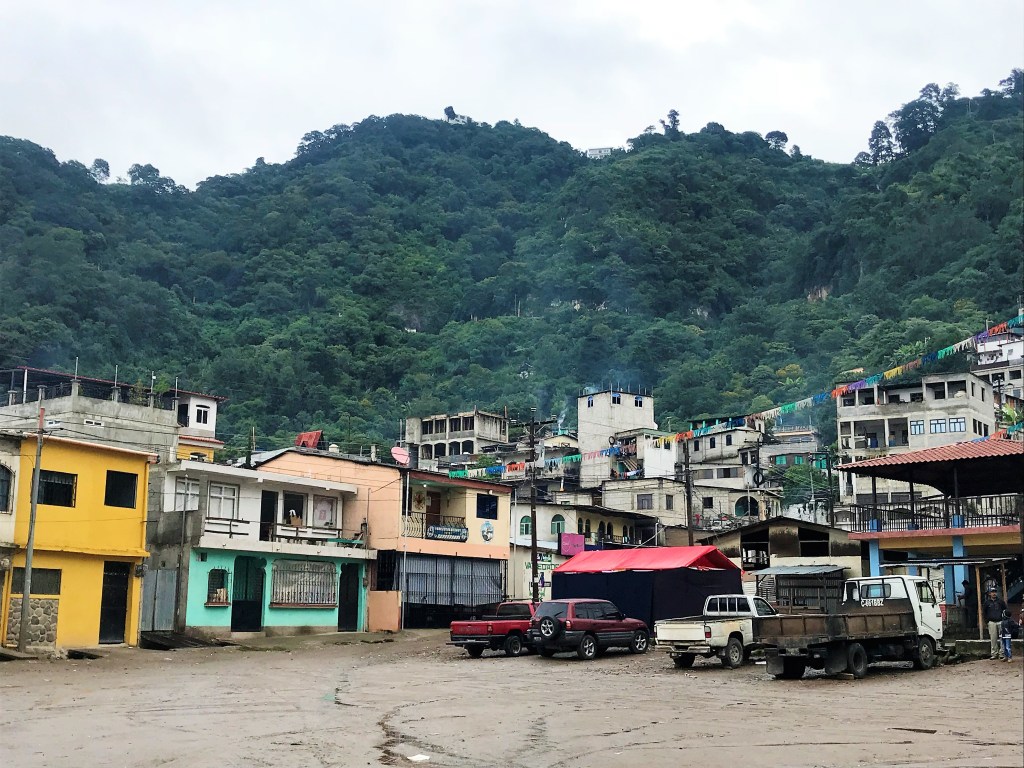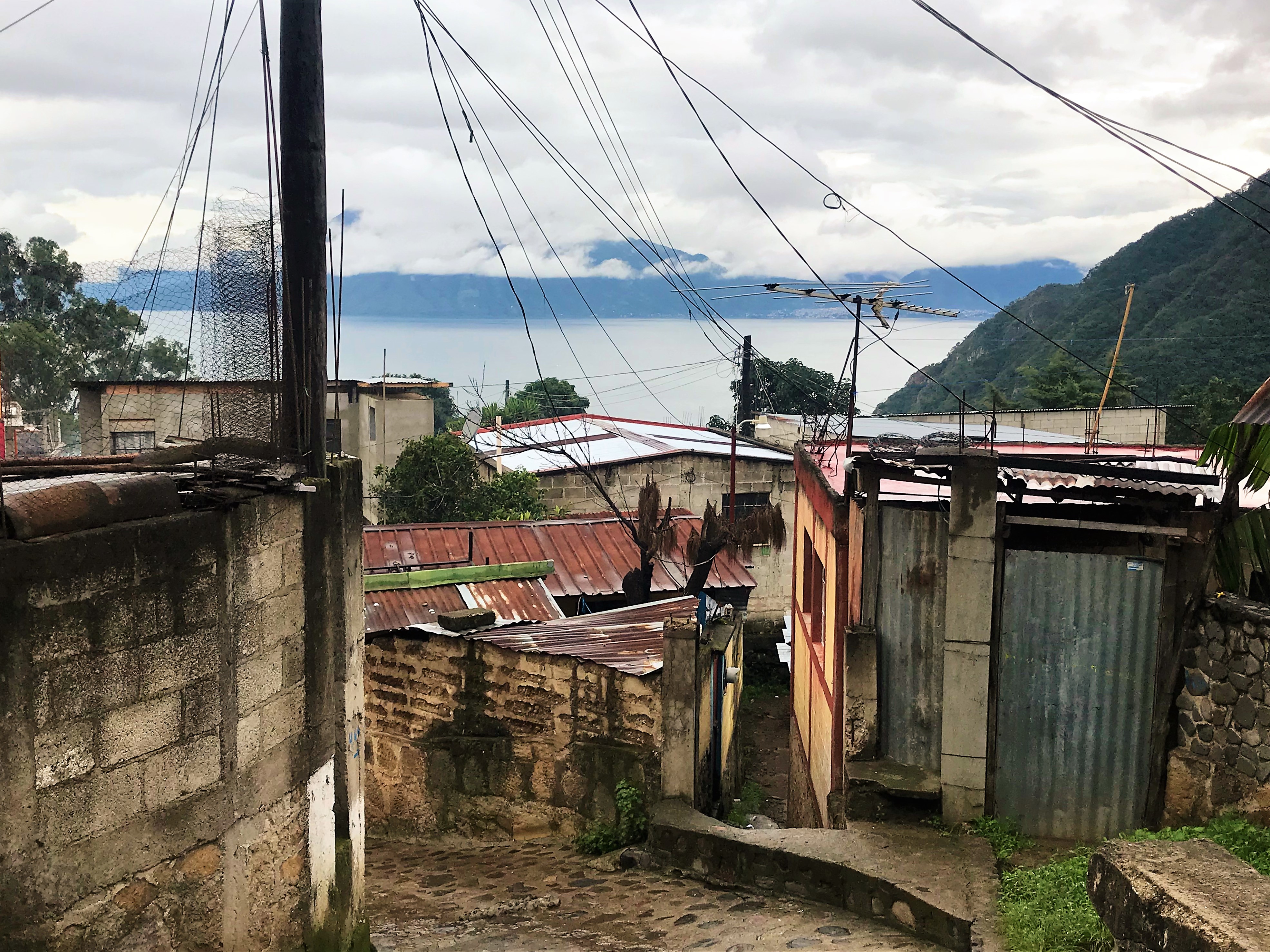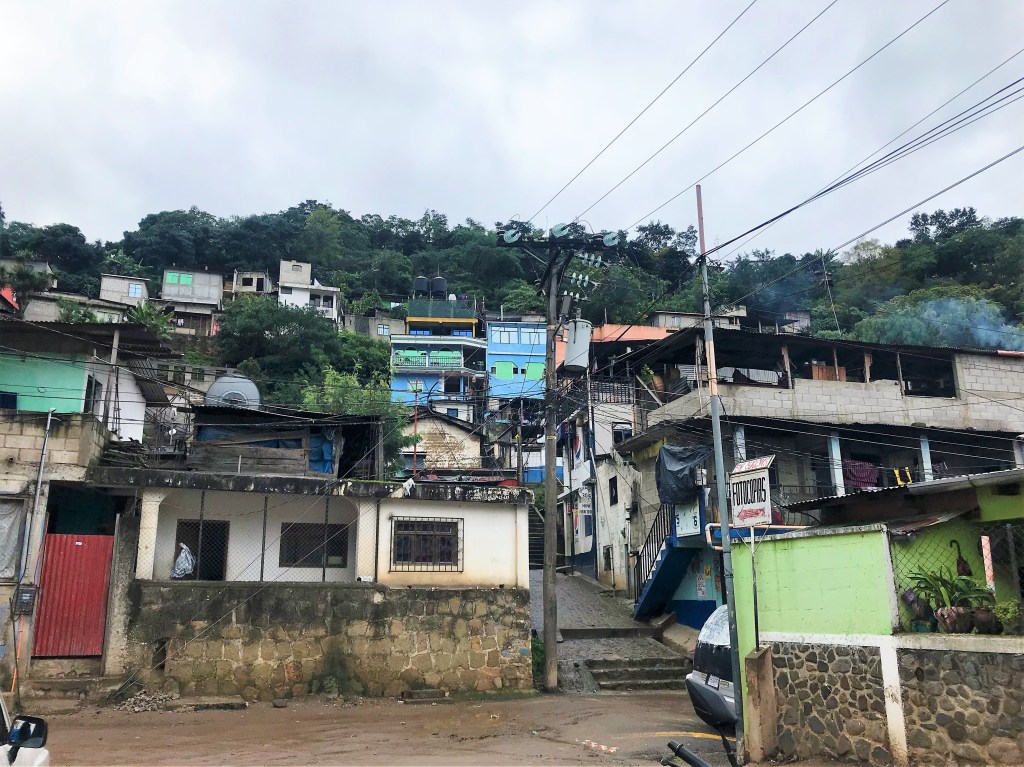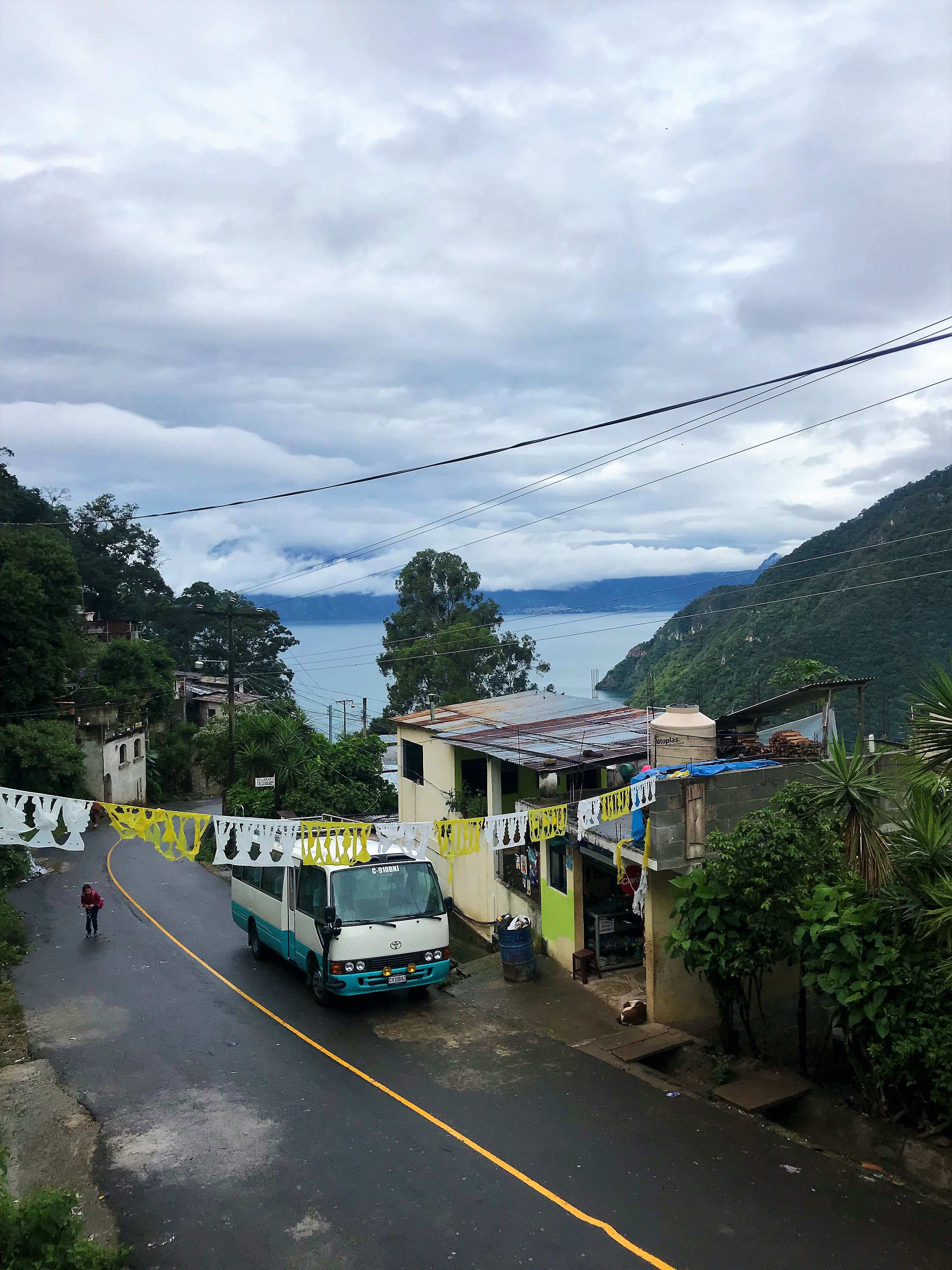 Back in the van to drive to the small village of San Jorge La Laguna, located along Lake Atitlan. More crazy driving and this time, a large chicken bus is passing on a sharp bend in the road and ends up in our lane. Everyone in the van gasps…like it is coming for us head on. Thankfully, our driver Eric is a superstar and I guess maybe these locals are used to this kind of driving? Again, a heart attack worthy drive. As we get close to the village it gets really foggy which makes it even scarier for driving. Seriously.