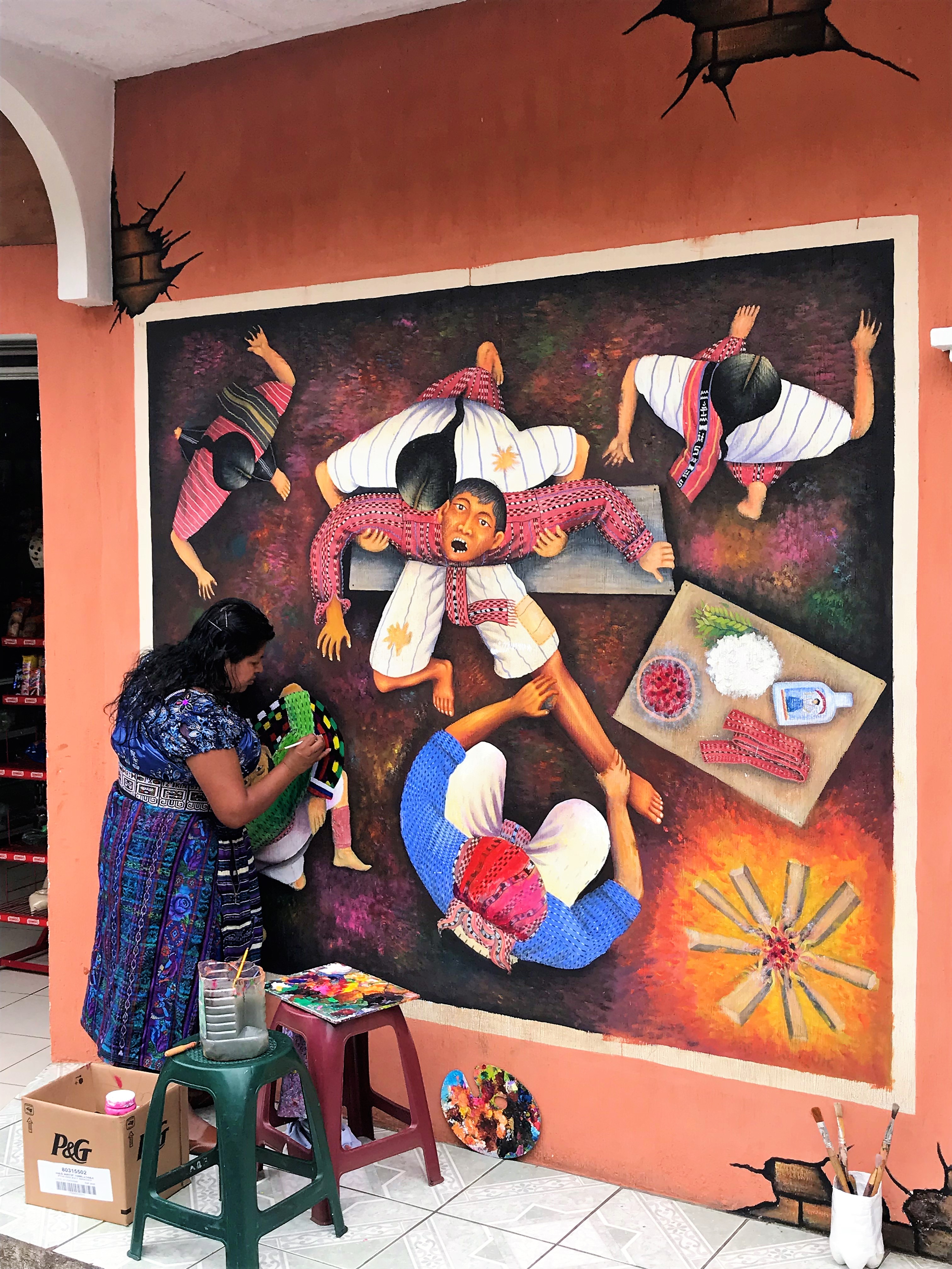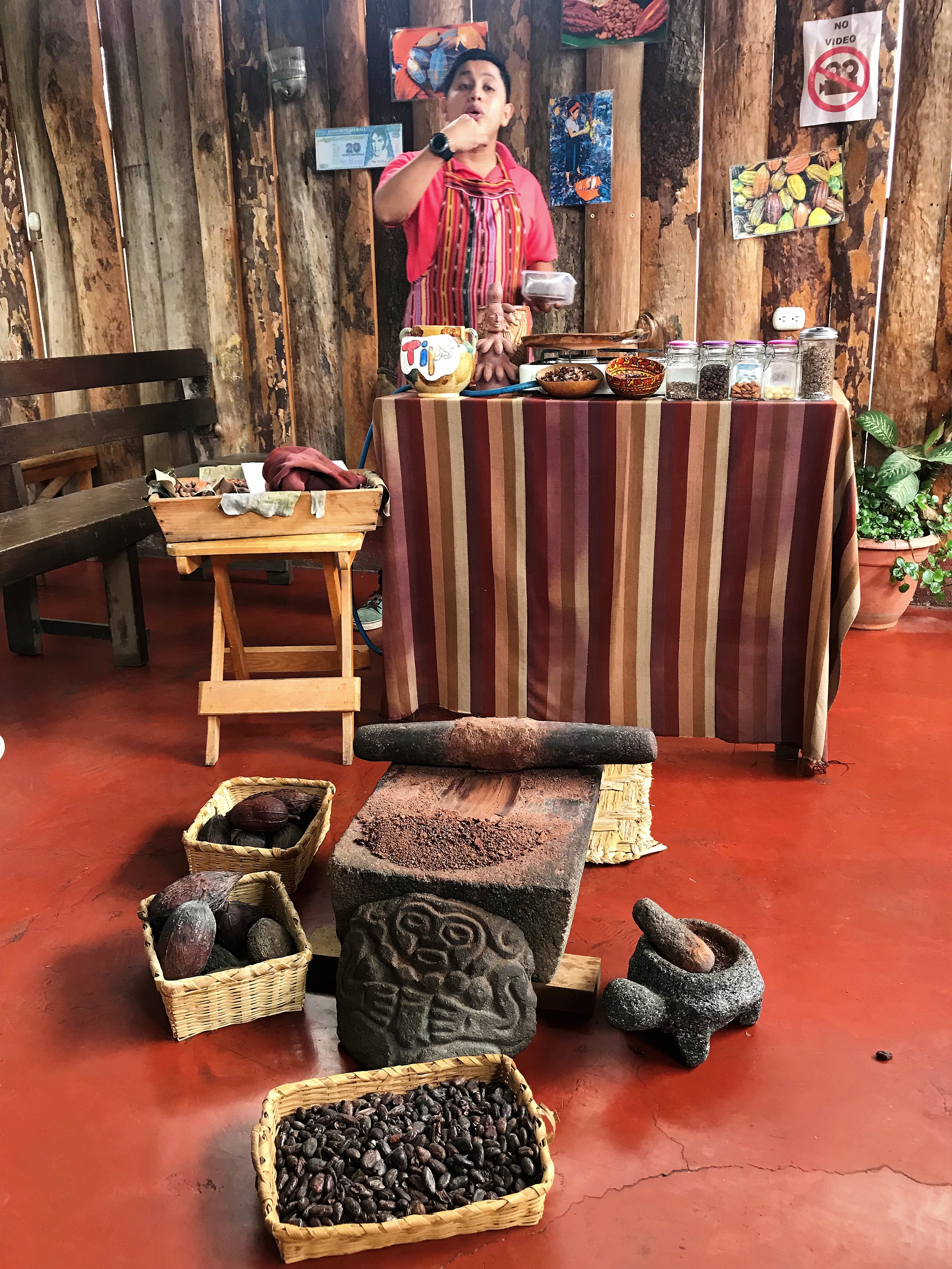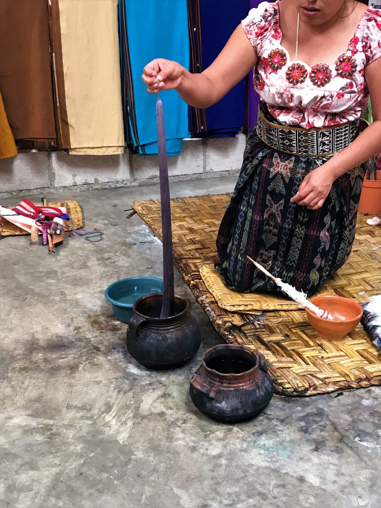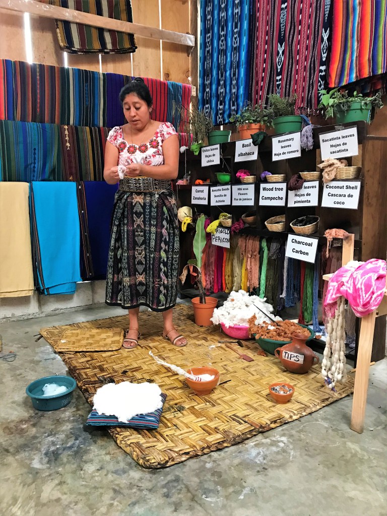 Then it needs to be dyed….the dyes are made from plants, spices, flowers, charcoal, woods, fruit…it’s so neat! Guatemalan textiles are so colorful so you need options! Then she puts the dyed cotton on this loom and shows us how it’s woven together…it blows my mind how she does this.