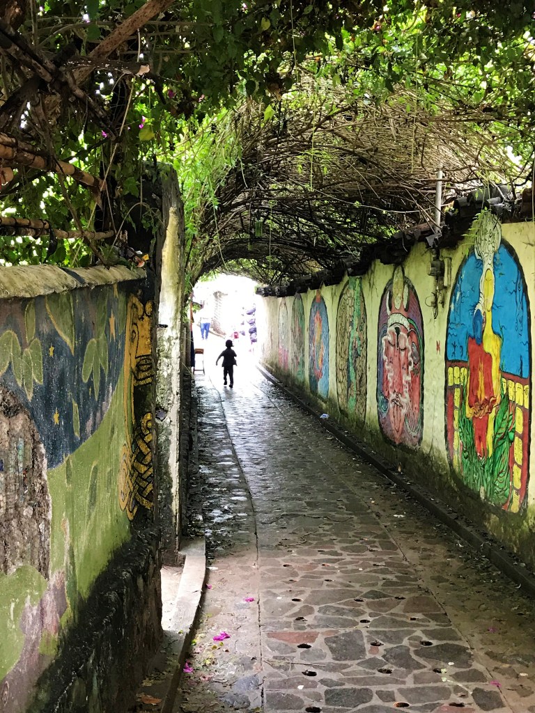 I wander down the narrow alleys and try to find a cool spot to eat. Along the way there are many pretty murals to admire and I find something I think is cool…a wall that honors the local children for converting plastic into 15,00 eco bricks over the last 15 years. Nice job!