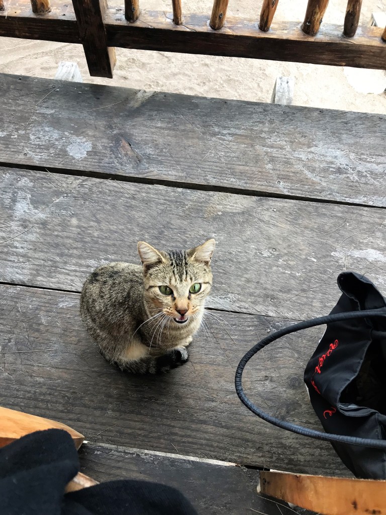 I order these saucy cheesy fries and a Gallo beer and I’m a happy girl. I make a new friend too…a cute little kitty who wants to share my lunch.