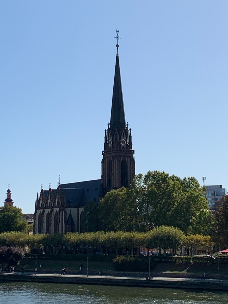 I see a large church on the other side in an area called Sachsenhausen, and I want to go have a look. It’s called Dreikonigskirche- it looks impressive from far away and also close up.