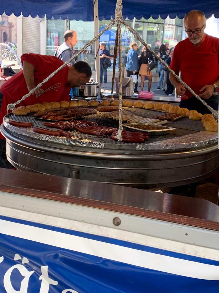 Now I’m getting hungry so I head back to Romerburg and find this restaurant called Alten Limpurg. You can sit at a table or grab something from the takeout window and stand at a barrel to eat. I choose the barrel and order Frankfurt’s most famous dish, Frankfurter Wurstchen – A sausage served with bread. It comes like this: