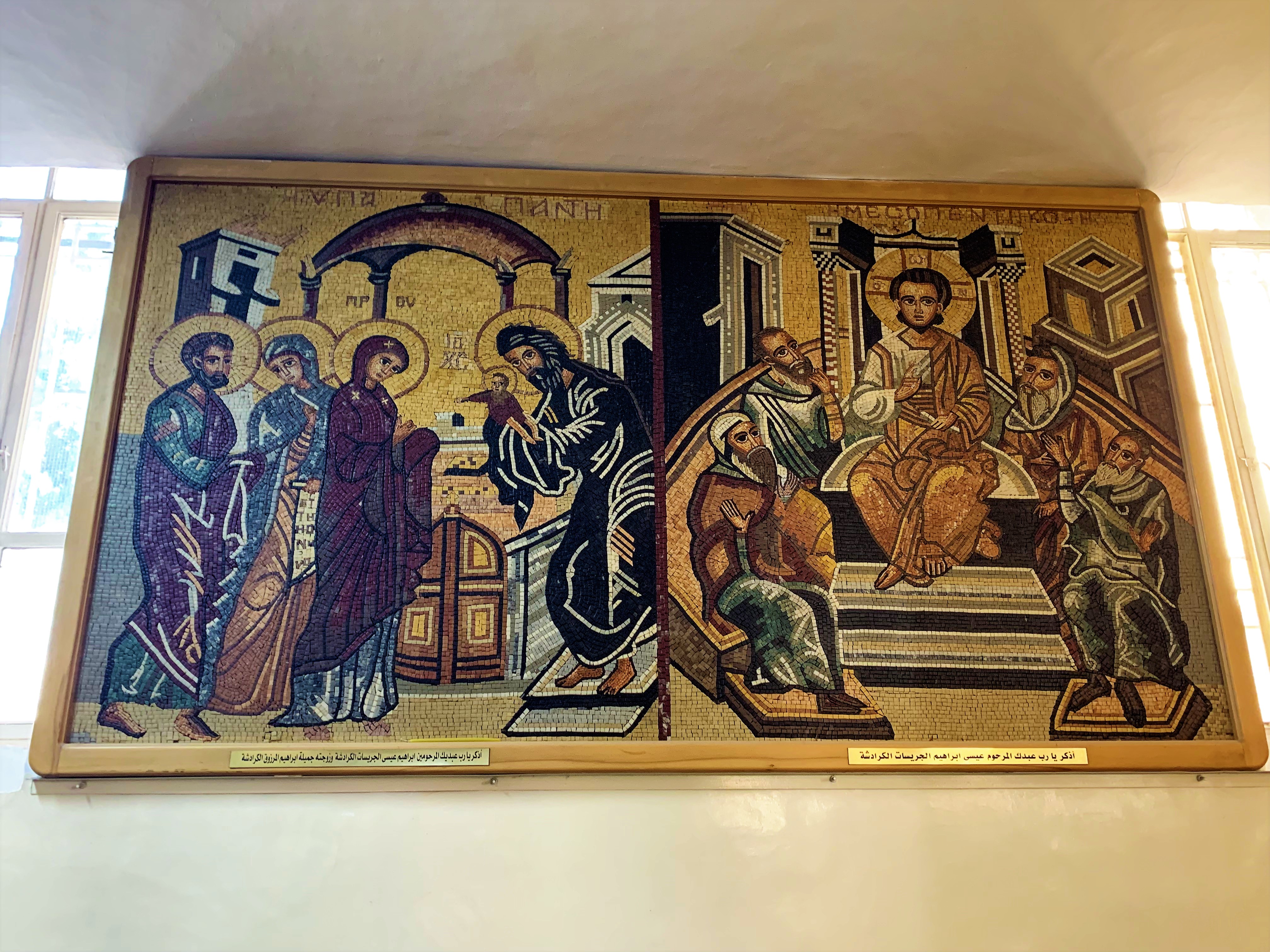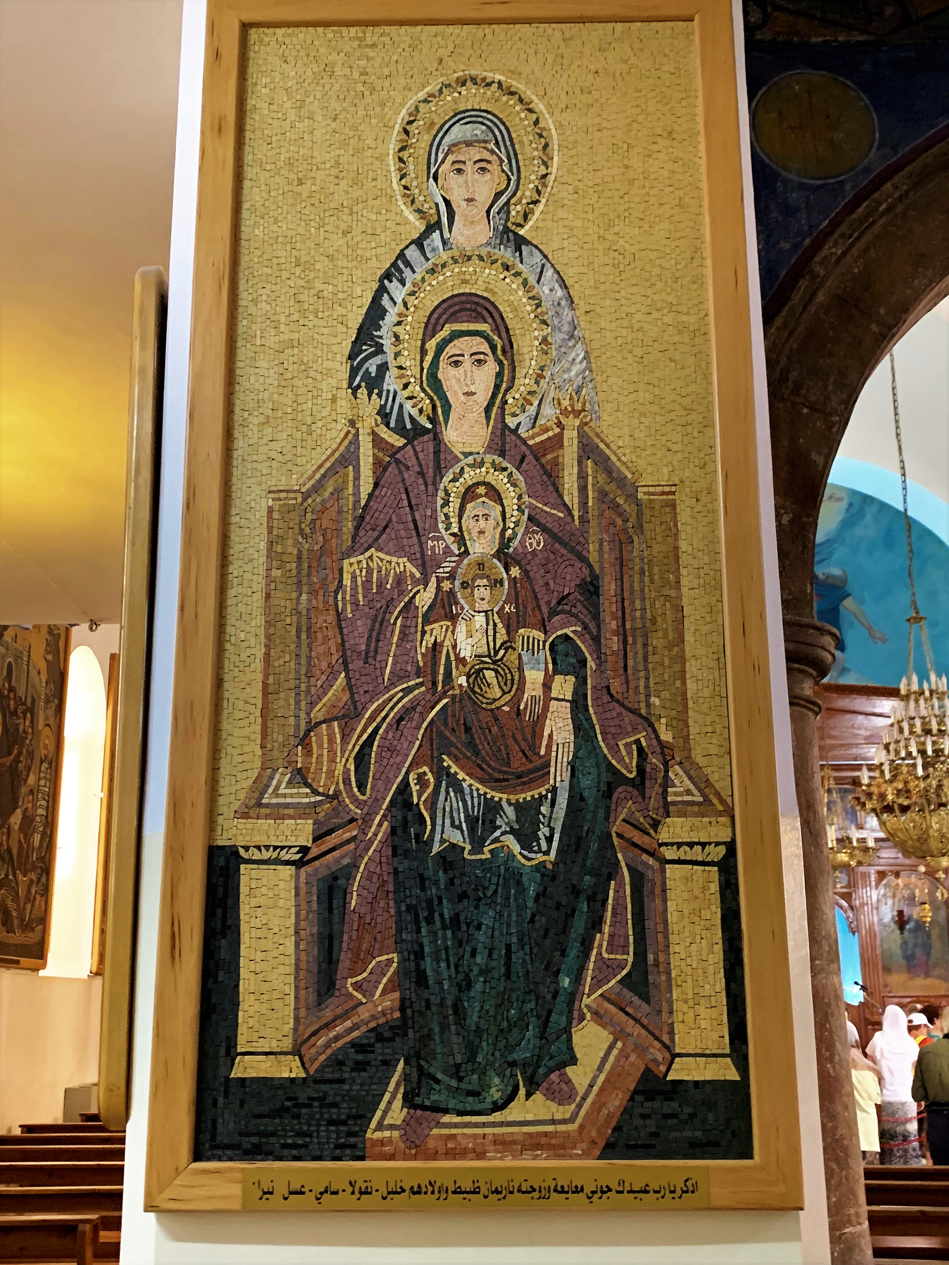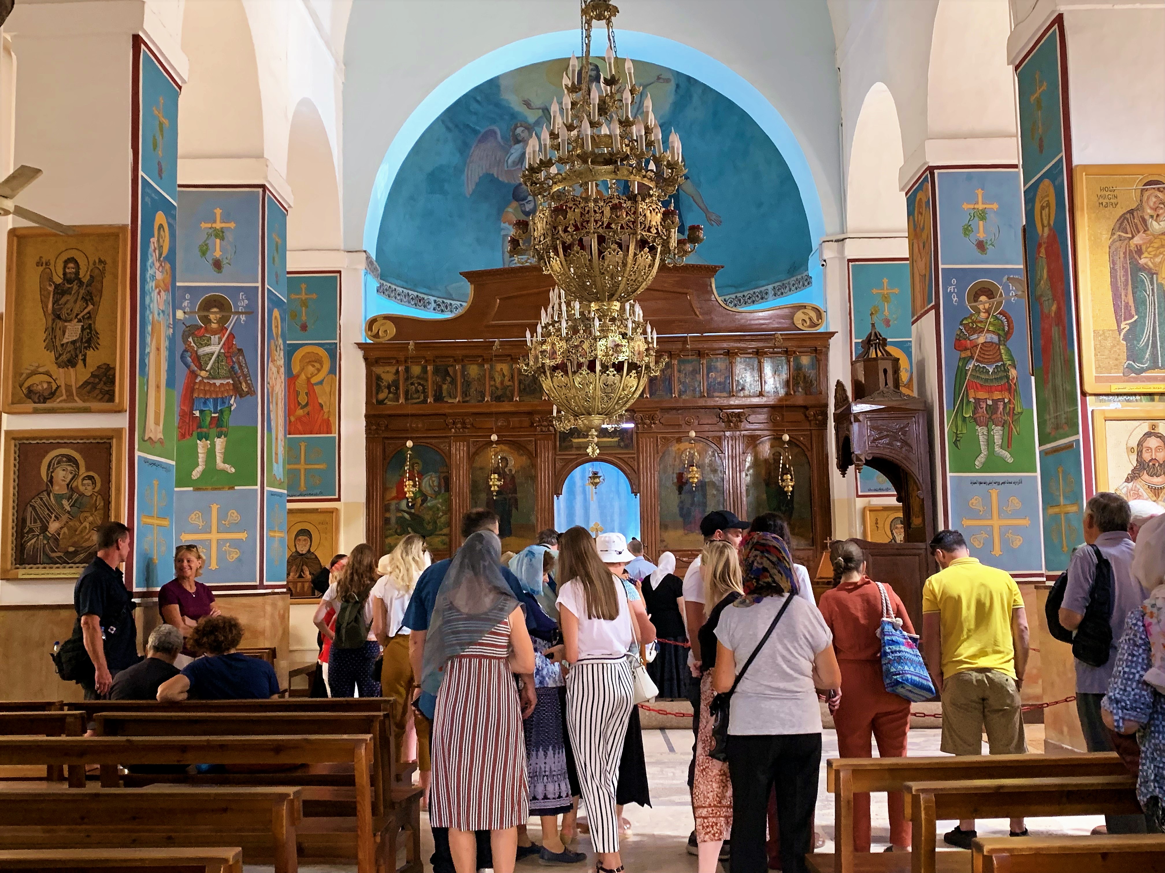 Khalid (our tour guide) ushers us into a tiny hot stuffy room with chairs so he can ramble on for an hour about the map of Madaba. Ok, it’s more like half an hour, and that’s WAY too much of a waste of time for me. I need to explore! He finally lets us go into St George Greek Orthodox Church to see the floor mosaic and it is nothing short of amazing.