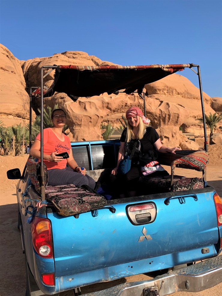 The next morning, we have another fantastic meal at the camp and then pile into a bunch of trucks to head out for our desert safari. Before we leave, I get one of the cute Bedouin guys at the camp to properly tie that cool scarf I bought in Petra around my head.