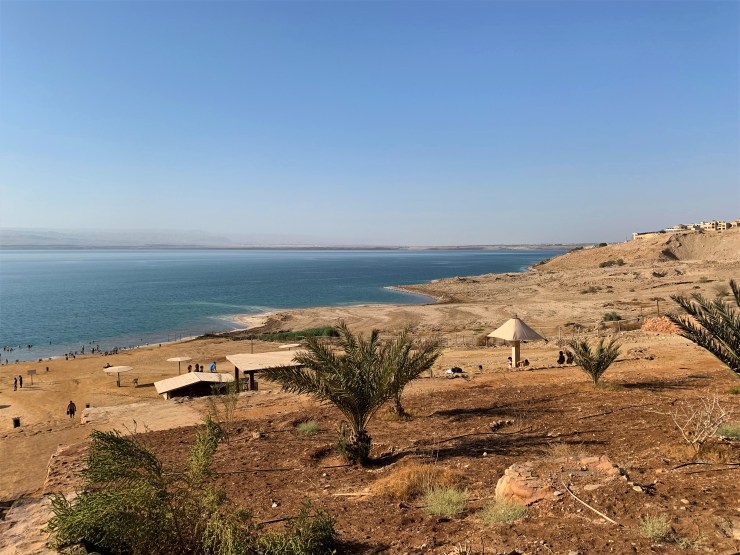 The Dead Sea. Getting off the bus, it is hot as hell. And I mean probably the hottest day I’ve felt the entire time I’ve been in Jordan. I’m assuming it’s also because we are way below sea level. 430 metres below to be exact. This is the lowest land elevation on earth. Pretty neat!