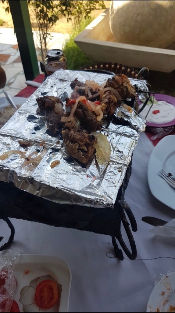 By this time, it’s late afternoon and we are getting HUNGRY so it’s time for lunch. We drive over to a place that can handle large groups – there has to be at least 3-4 groups here now. We sit at one of the long tables and they bring a bunch of food to the table and everyone shares. There’s grilled beef and chicken with grilled veggies, rice, hummus, pita bread, eggplant. And sweet dates for dessert. It’s actually a pretty tasty meal and there’s plenty of food to go around.