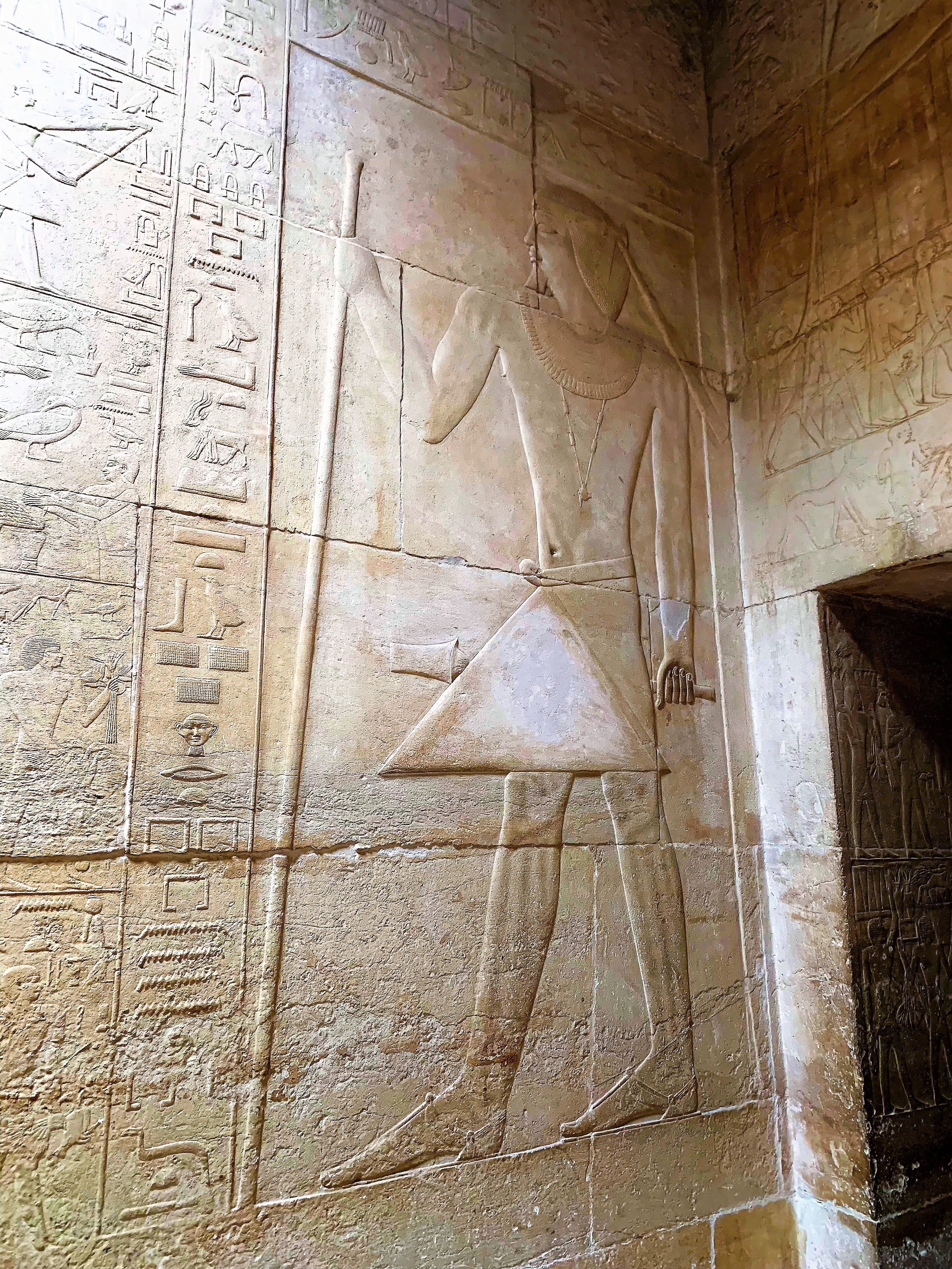 Next, we head over to the nearby pyramid of King Teti – nowadays it looks more like a small hill but below the ground is where we will explore the chambers of his tomb. And down we go, a long ramp that leads deep underground to a hall with 3 chambers. At one point the ceiling is very low and even though I’m short, I still have to hunch over to walk through it.