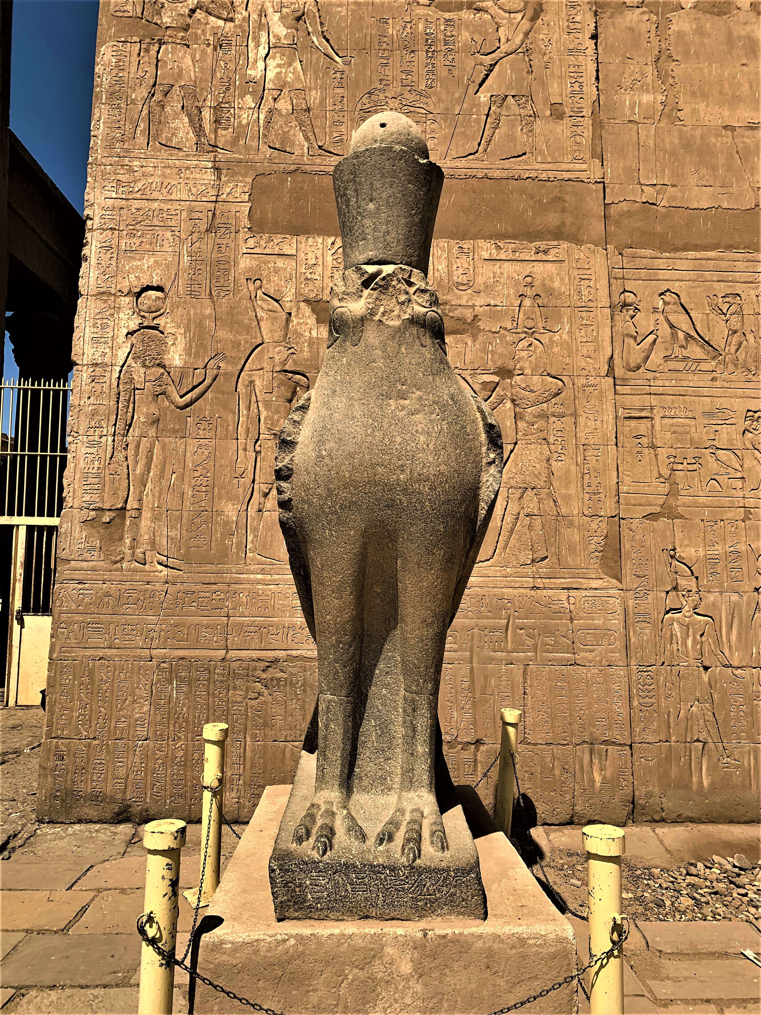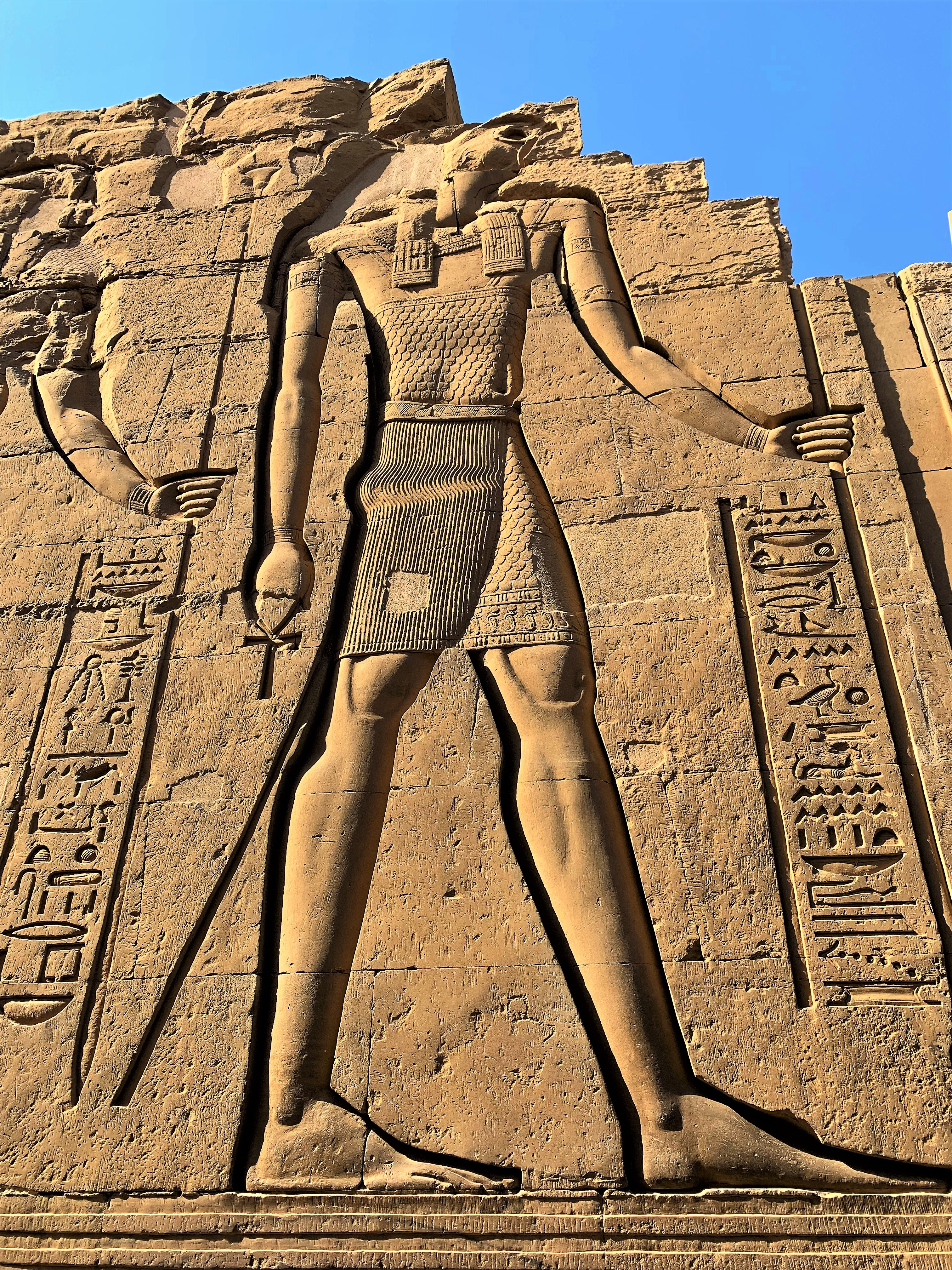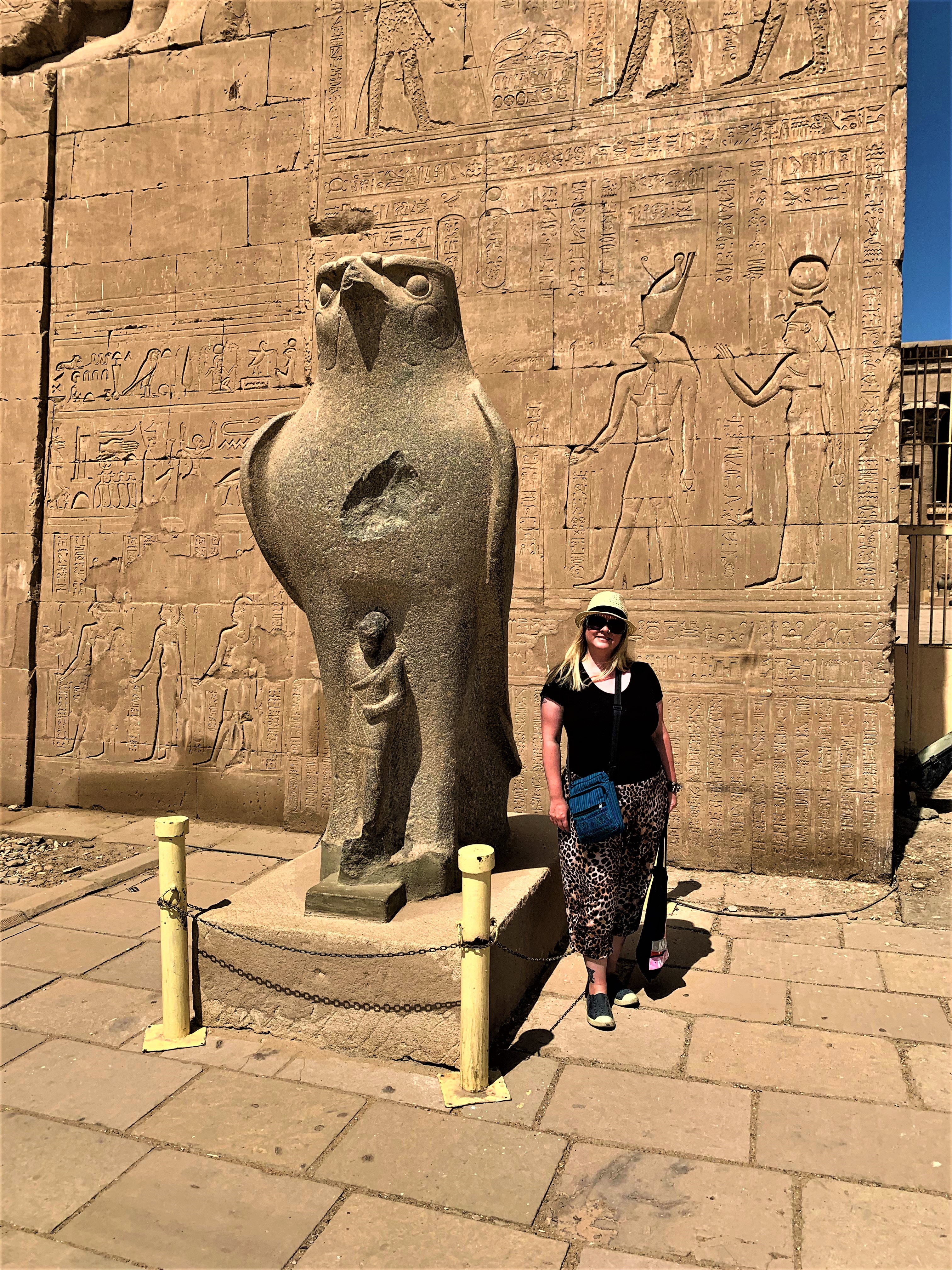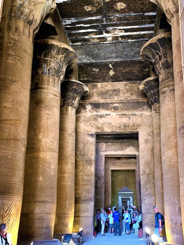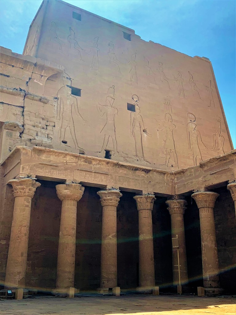 The inscriptions on these walls provided so much information about language and religion during this period and the giant hieroglyphics make you feel small. We walk through the Great Pylon, where there are statues of Horus guarding the gates.