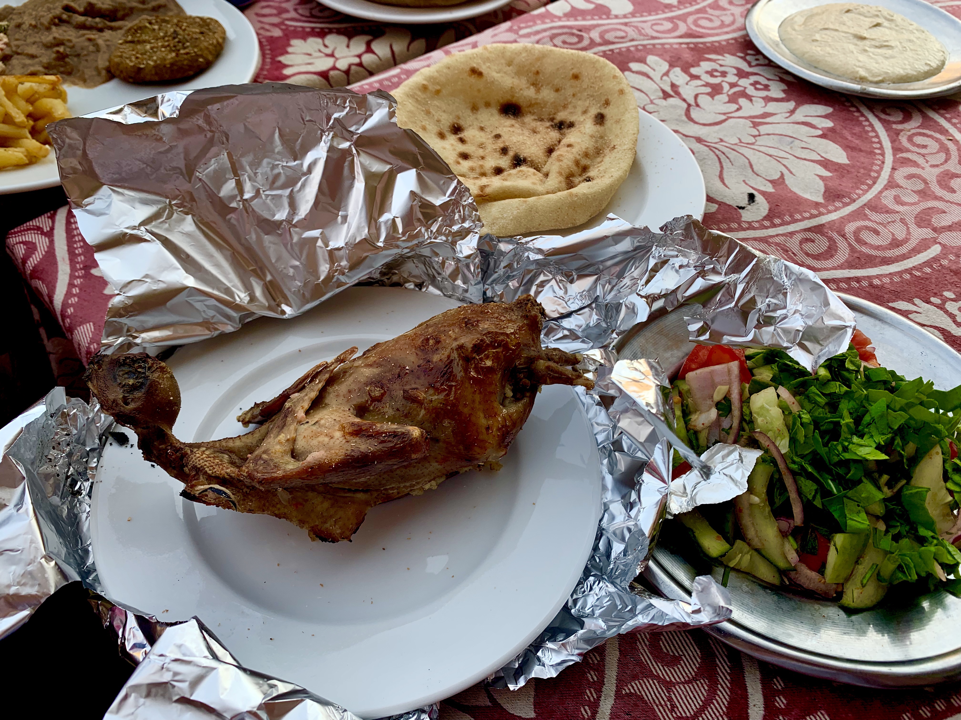 We sit outside at the tables of El Zahraa Café, and I decide it’s time to try some real Egyptian cuisine. Yes, it’s time for pigeon! I order the bird stuffed with rice, and it comes to the table in full pigeon mode – head and all.