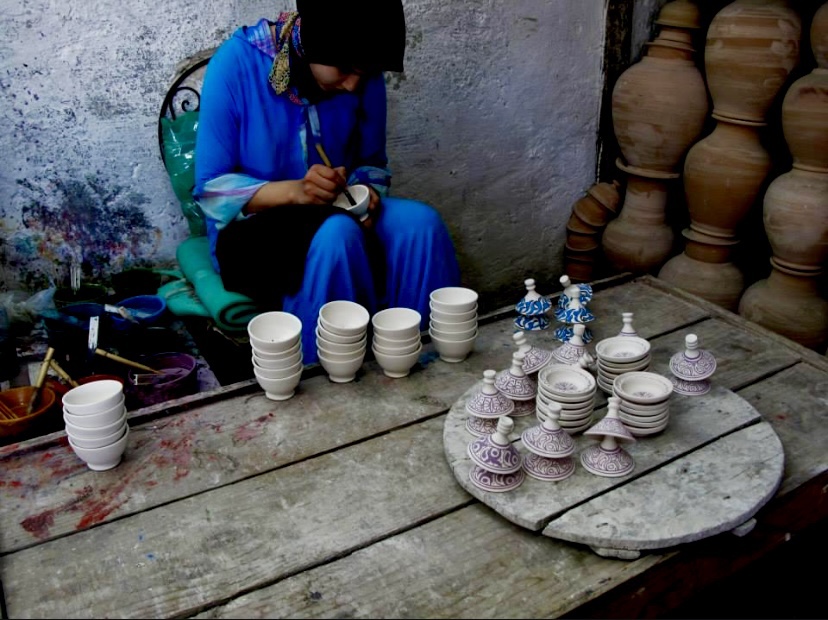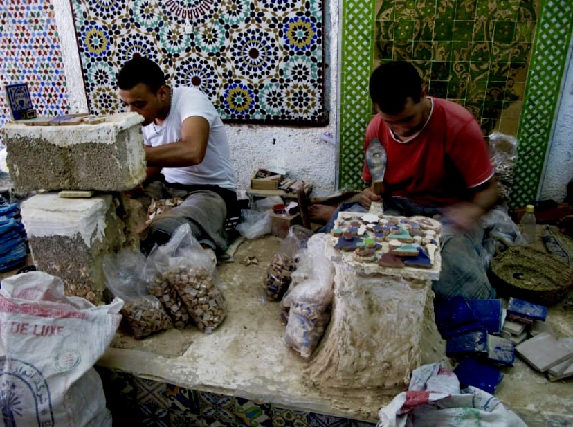 And now back down into the old medina to wander through the old souks making a few stops along the way. We arrive at a ceramics factory- guys here are making dishes, painting them, and chipping marble to make mosaics. Cool!