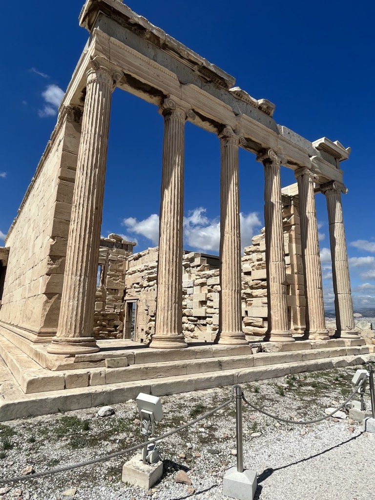 probably the most photographed structure here in Athens. It’s a former temple dedicated to the goddess Athena, and it also served as the city treasury. Fun Fact: the word Parthenon comes from the Greek word for “maiden”, “virgin”. You can wander around the perimeter, but can’t go inside. On the south side, you can see where an explosion in the 1600’s damaged the walls – it hasn’t been refurbished.
