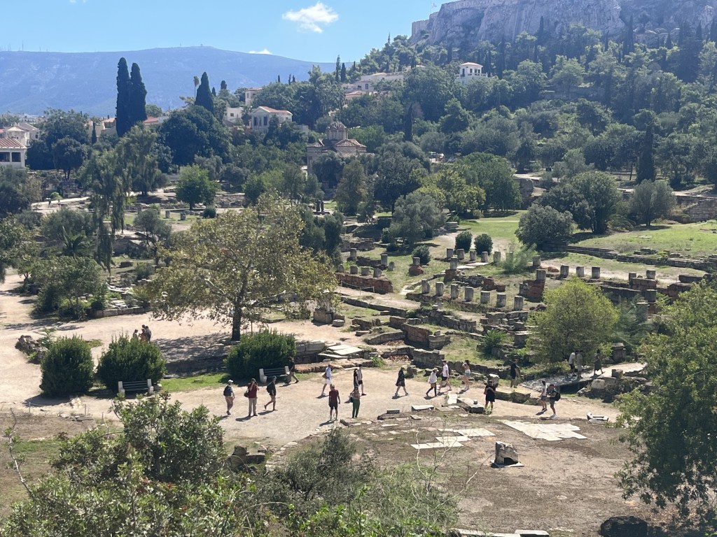 From the hotel we walk back into Athens central and we explore the Ancient Agora of Athens, which was used as a commercial and residential gathering place.