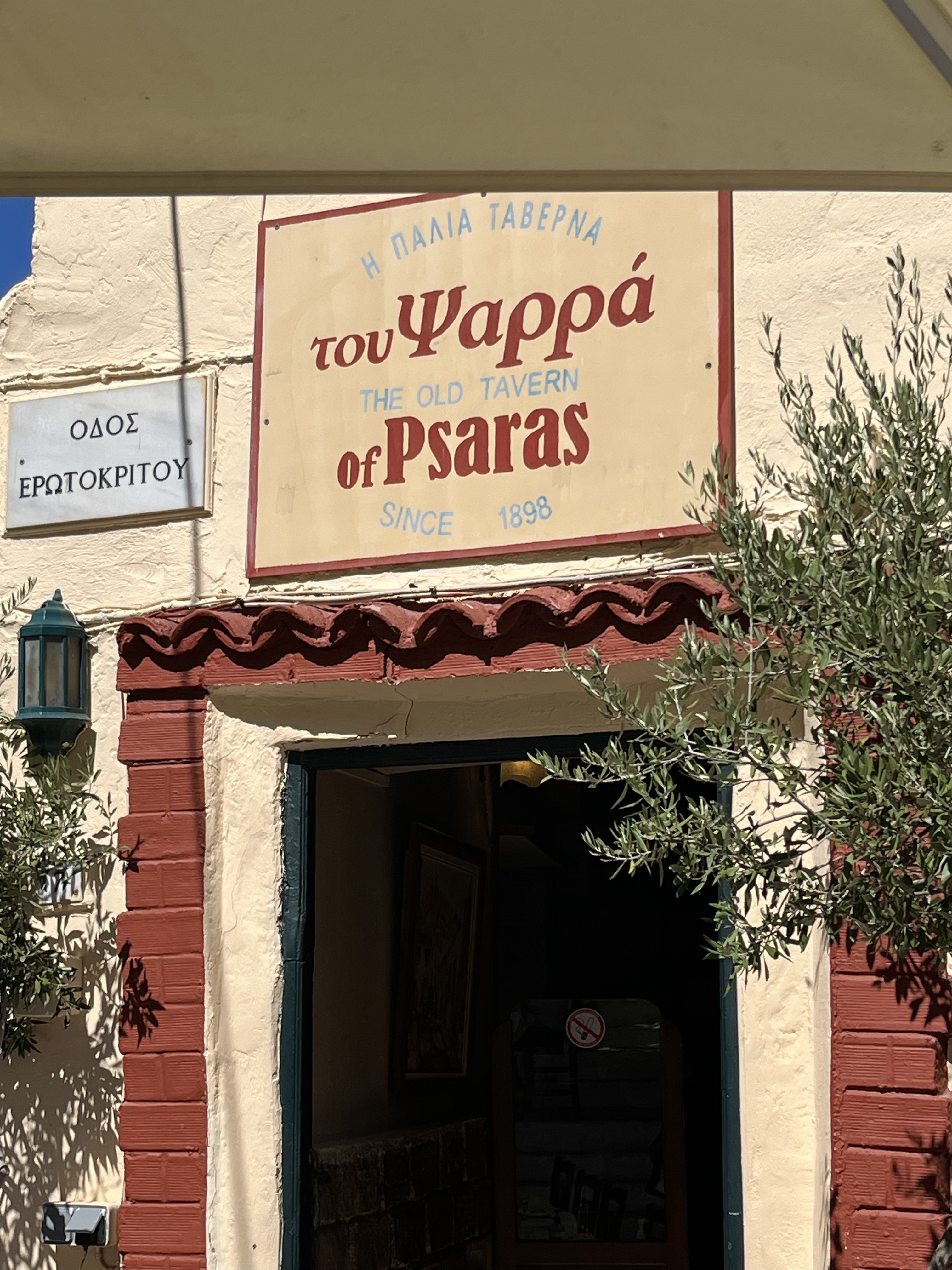 We wander into the Plaka to find a cool place for lunch; we end up at Psarras Tavern, a restaurant in an old stone mansion that’s been around since 1898 – one of the oldest in Athens. We sit outside on the deck and I have the chicken skewers and fries. It’s really good!