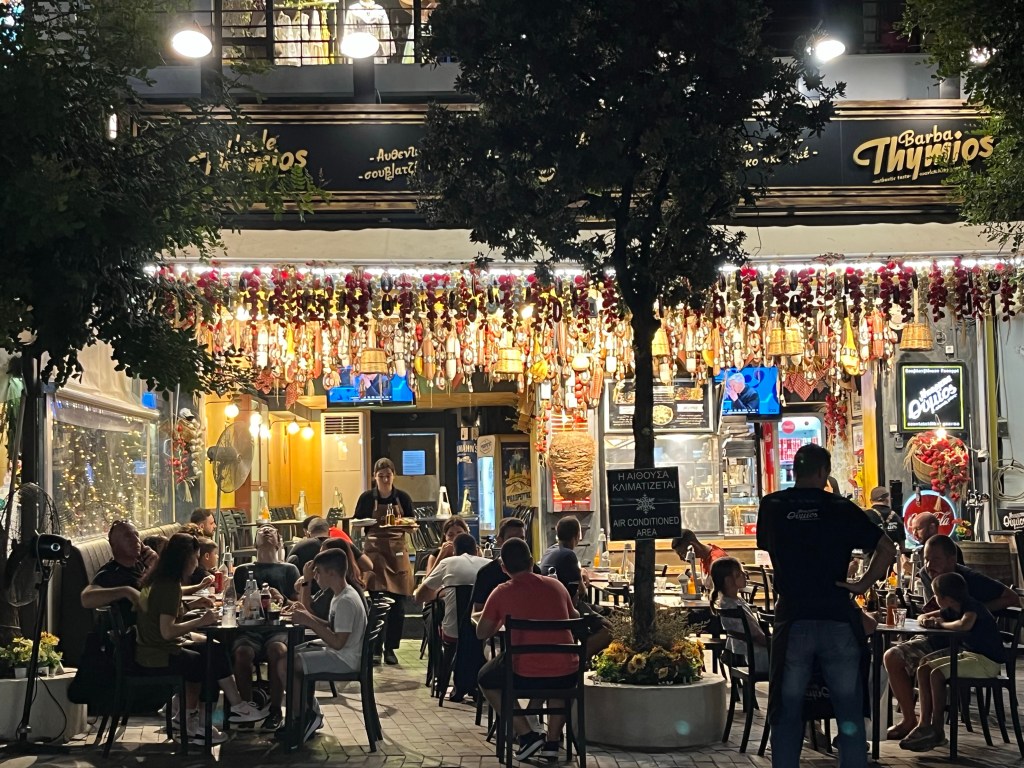 The central squares of Heraklion are jumping with action tonight so I sit outside on the patio at Uncle Thymios.