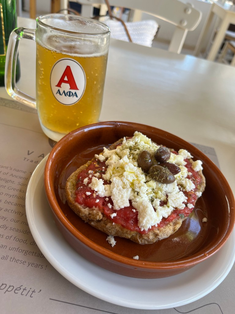 I order a beer, and dakos Cretan bread. It’s a soaked dry bread topped with tomatoes and cheese, drizzled with olive oil and seasoned with oregano. At many restaurants in Greece, a host will stand outside and call out to people to come and eat at their place. The guys at this restaurant are so funny…. they would talk about or make fun of everyone after they walked past. They were speaking Greek, but I could tell what they were doing. Haha.
