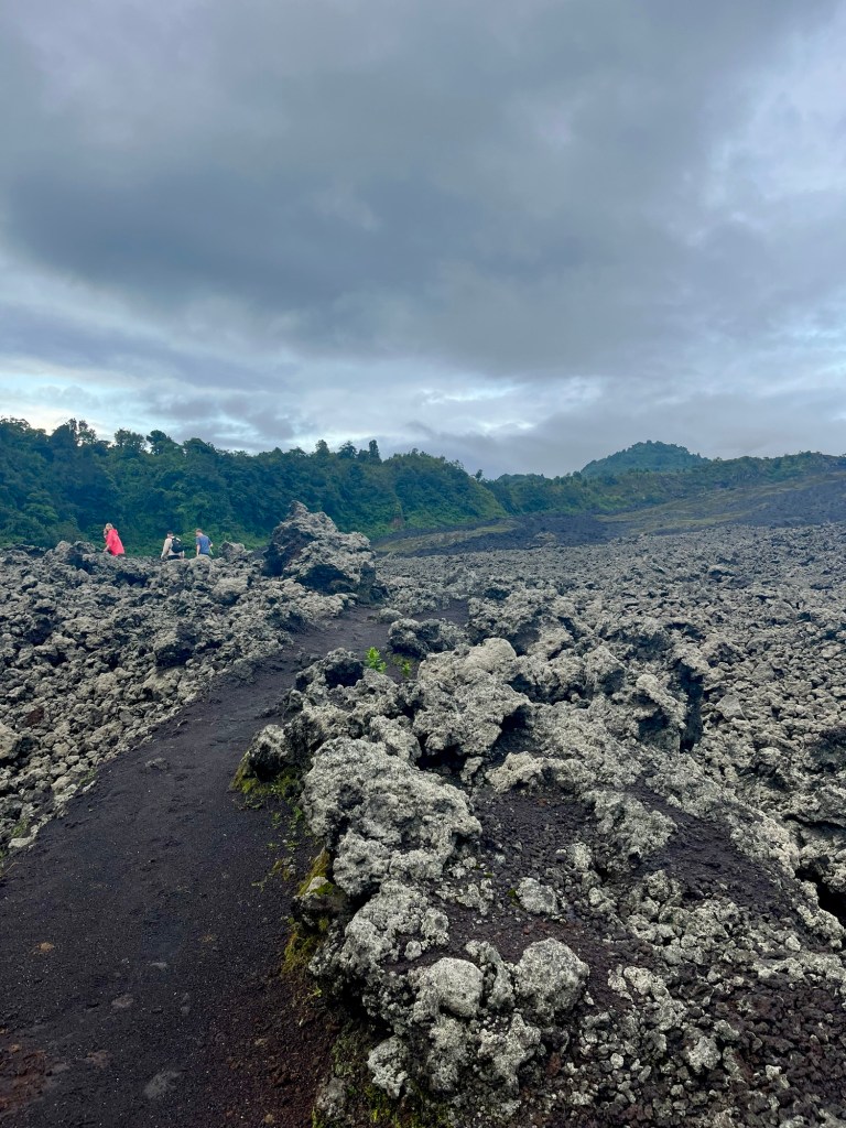 When the rest of the group catches up, we walk further into a garden of rocky lava remains and hot smoke rising from the ground.