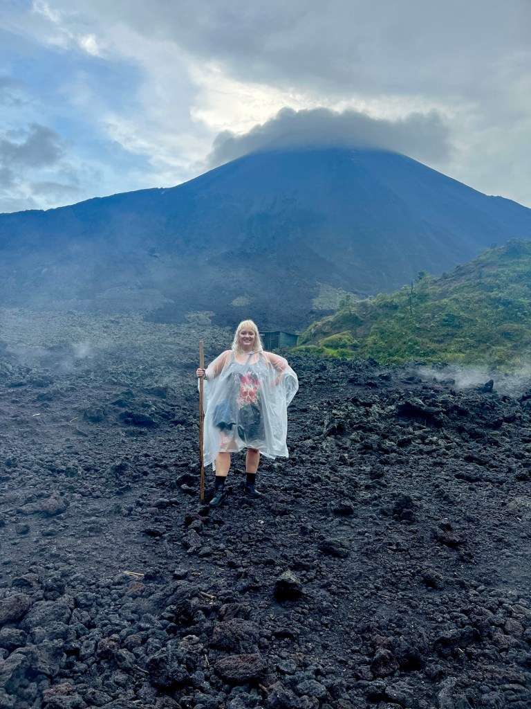 After we’ve picked everyone up from various hotels around Antigua, it is an hour and a half drive to the volcano. The road is windy and I manage to avoid carsickness, but my ears are getting completely messed up as we drive to higher altitude. (I’ve started this trip with a minor cold, and my ears will stay messed up for the next couple of weeks. Ugh.). There are tons of volcanoes in Guatemala, and Pacaya is one of three active ones here. Once we arrive at the starting point for the hike, it starts to pour rain. Like, “do I want to hike up a volcano in this shit weather” kind of rain. Luckily, I have brought my rain poncho, but let’s face it, I’m still getting wet. A group of young boys are trying to sell everyone walking sticks for the hike, and I understand the value of one of these things, so I gladly pay the few dollars to rent one. Let’s Go!