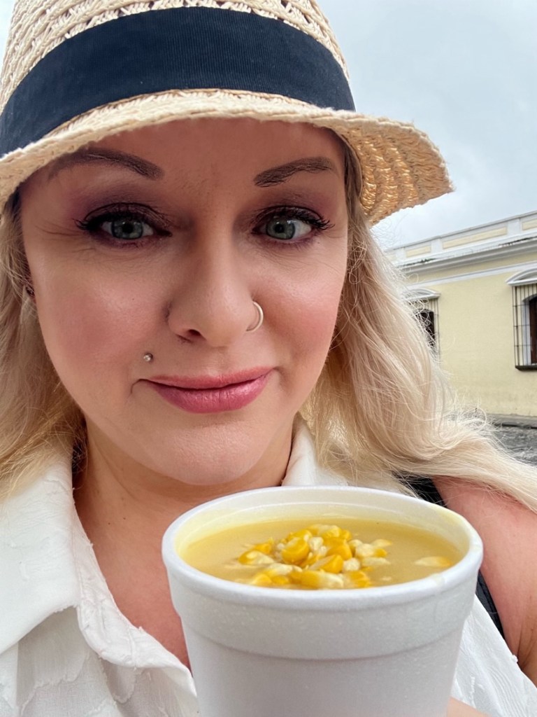 I’m getting hungry so I head over to La Merced church to see if there’s any food stalls set up. Last time I got a delicious bag of fresh mango, but I don’t see any today. There is a stall that has some local snacks but I don’t have enough money on me. I do have a few small coins though, and that’s enough to get me a cup of atol de elote, a warm sweet corn drink. I love it! Some other awesome local treats to try are kak’ik(turkey soup), chicken pepian, and Guatemalan style tamales.