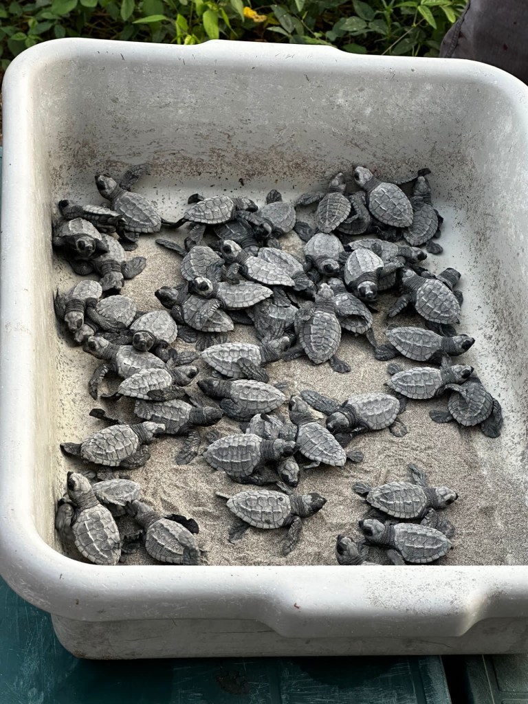 They bring out the baby turtles in a large plastic bin and everyone is permitted to pick them up.