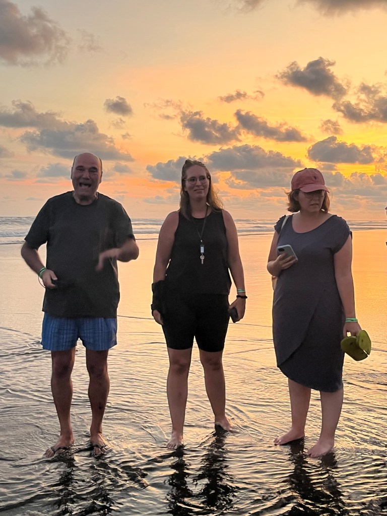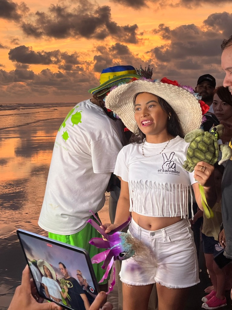It’s close to sunset, so it’s safe to release the turtles. One of the pageant girls carries the bucket of turtles out to the ocean and our large entourage follows her.