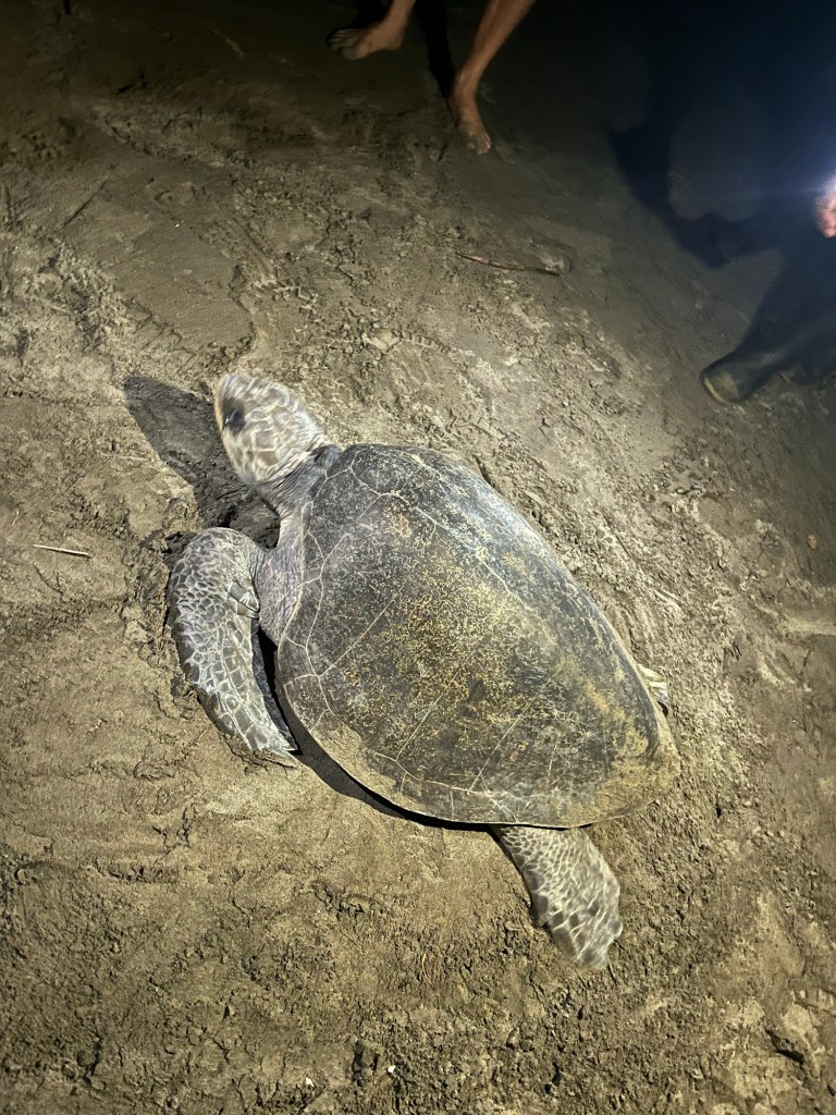 After this excitement, it’s time to wait hours for them to prepare our dinner. I have the pasta again, because it was soooo amazing the night before. As we’re finishing dinner, wacky Tom comes over and says they have spotted a turtle laying eggs. He invites us down to the beach to have a look. We can’t have too many lights, so there is one flashlight around the turtle who is in the process of covering up the eggs.