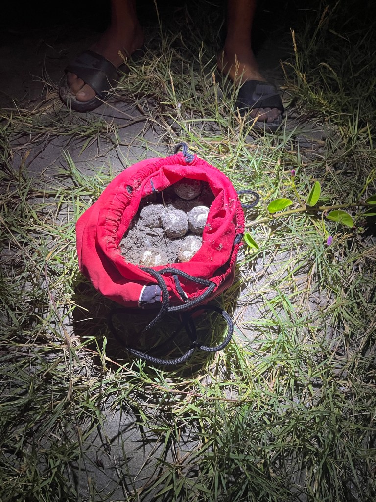 The turtle “experts” grab her before she heads back to the water to examine for any barnacles or possible illness, or just anything wrong in general. Then they pick her up and carry her over to the water. The explanation for this is that she is tired after laying the eggs so they want to make it easier for her to get back to the water. But isn’t that what she does naturally? Why interfere? Is it really helping? Will this stress her out more? I’m not a huge fan of this process but again, I know they are doing this with the best intentions in mind and I can’t say whether it’s good or not. The eggs are then gently put in a bag and taken away to be safely hatched.