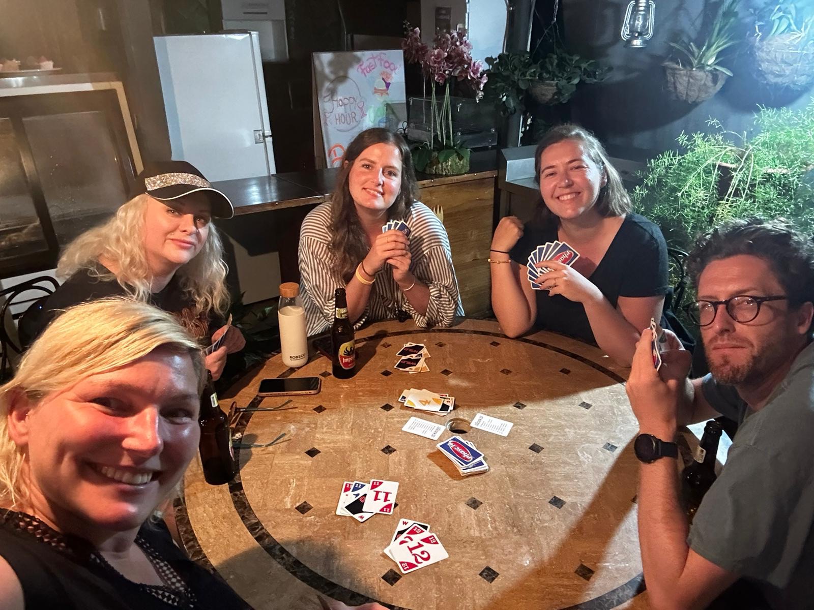 It’s been such an exhausting day, so the group is happy to stay at the hotel and have a quiet night in the lounge for dinner, drinks and games.