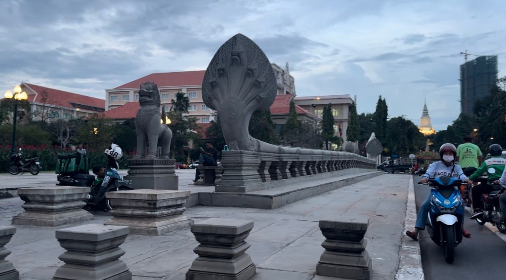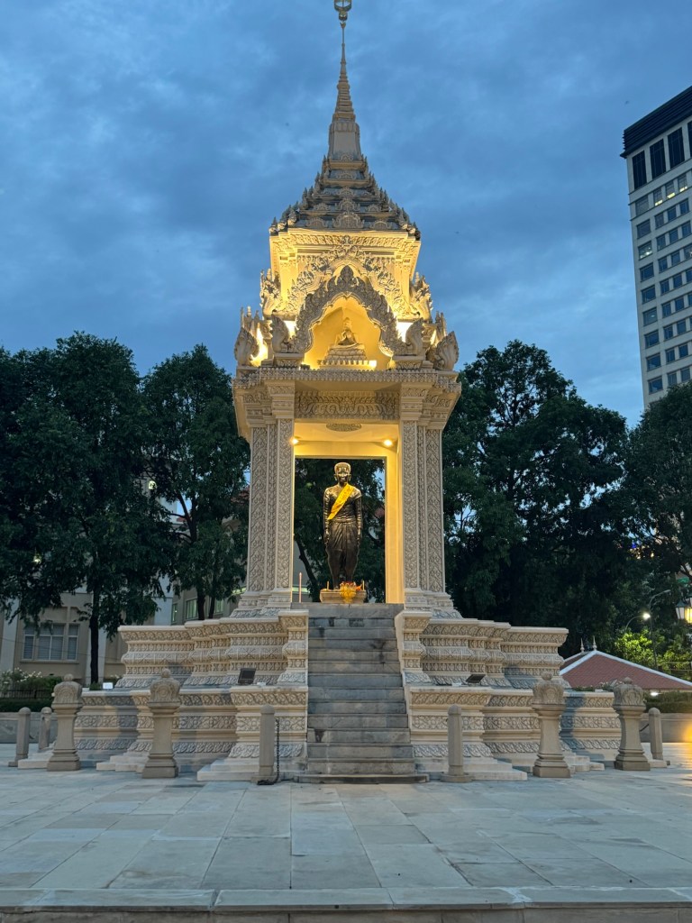 Before I go in, I have a quick peek to see if it’s worth it. I feel someone smack my butt, and I’m like, what the….. I turn around to see an elderly Cambodian woman, who smacked my butt because I was blocking access to a chair she wanted to sit in. She laughs, and her granddaughter apologizes. I think it’s hilarious, and I have a quick chat with them before going inside. Across from the pagoda are two large stupas surrounding a statue of King Norodom.