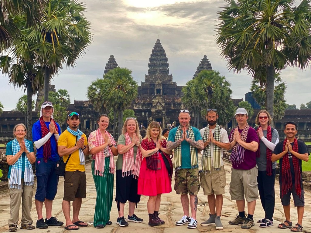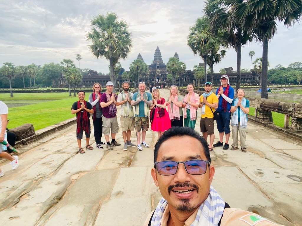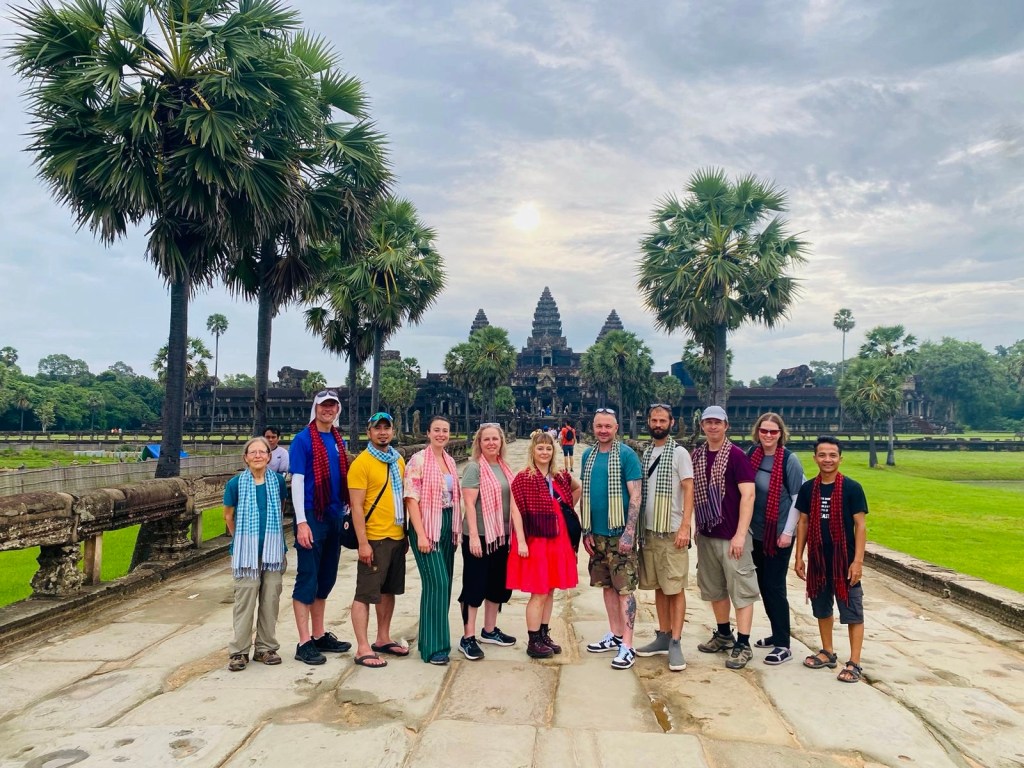 We gather in front of the temple for some group pics and Ratha has a surprise gift for us – traditional Cambodian scarves!! The funny thing is… this morning, he’s wearing a red and black checked one and I had asked him where I could buy one. Now I don’t have to!!!