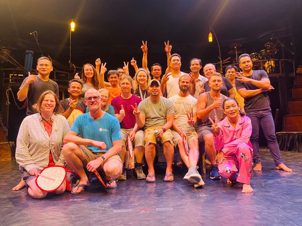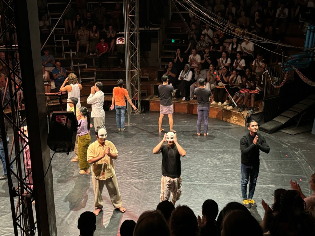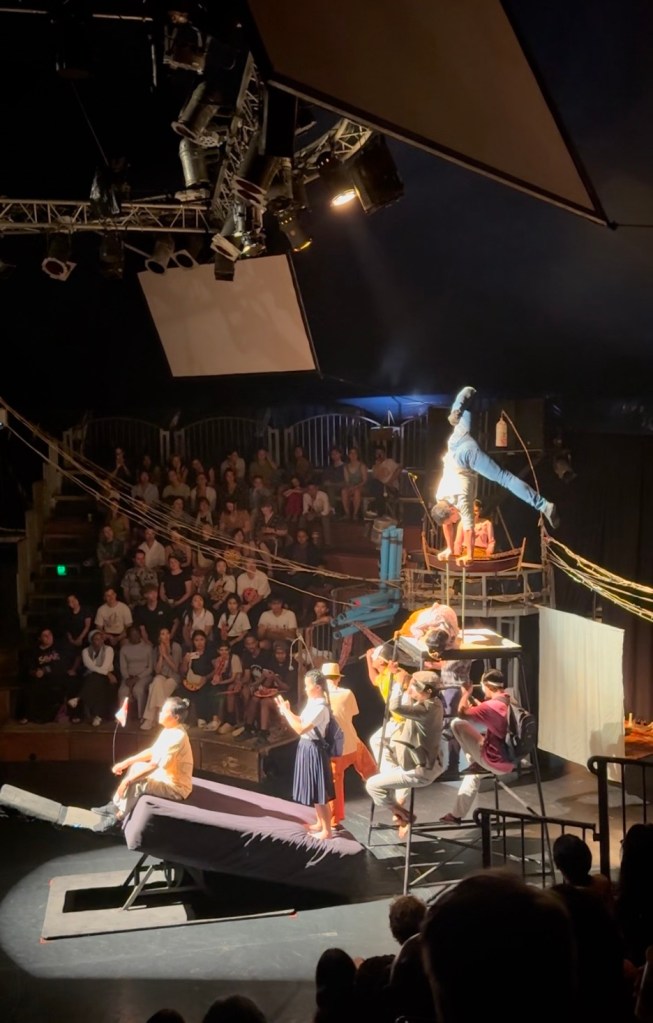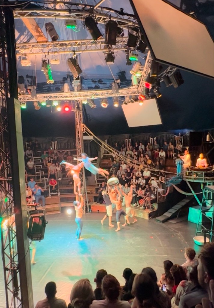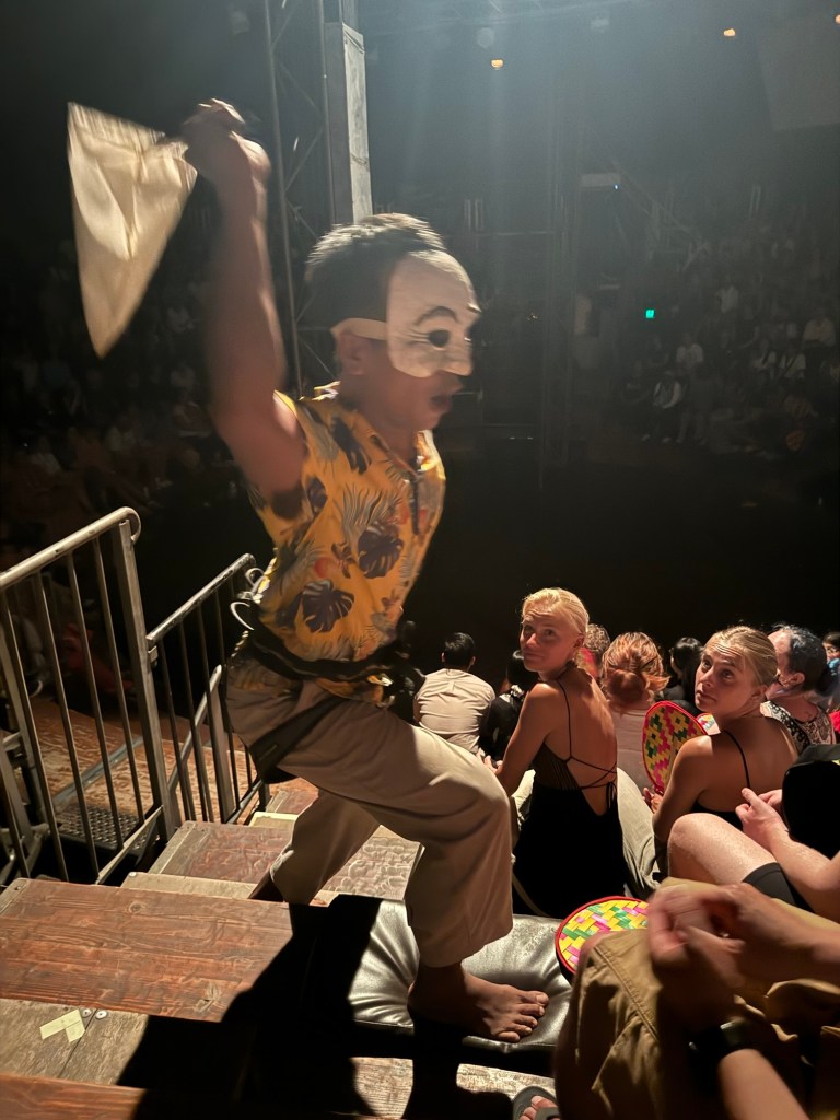 After dinner, we are escorted inside to our seats and they give us fans, which is brilliant. The theatre is a round shape, and we are sitting off to the side. And I have a bit of an obstructed view due to a giant pole. The show starts with some acrobatics and a swinging pole, and some dancing.