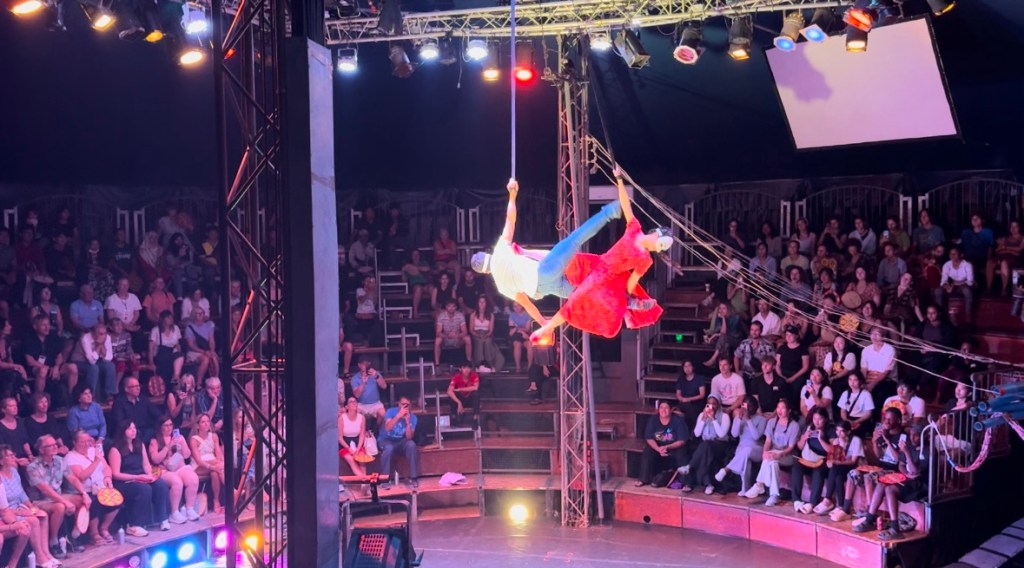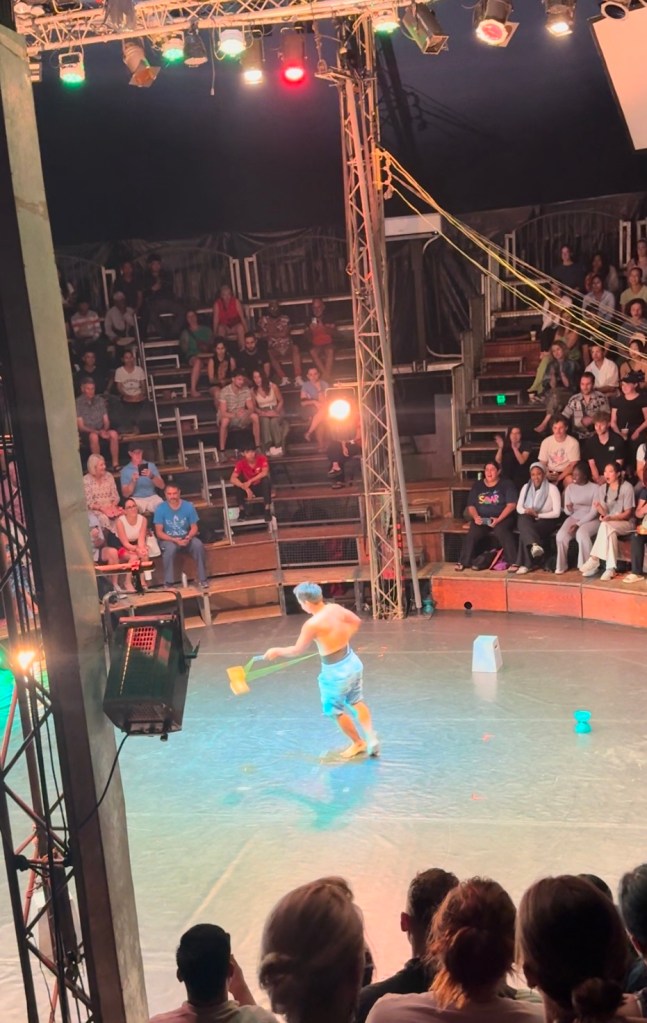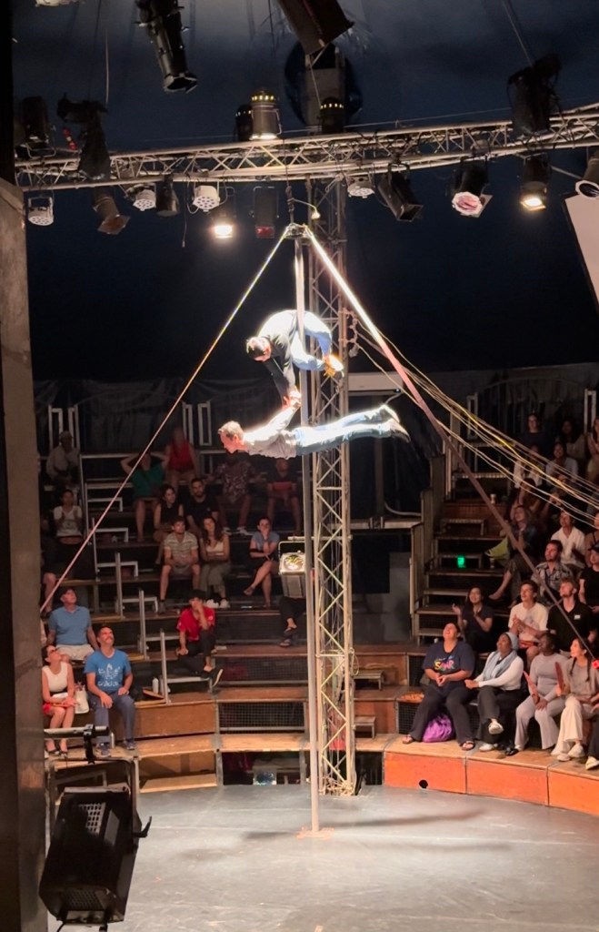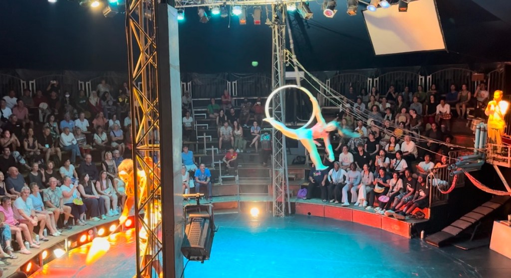A girl spinning around in the air on a giant hoop, with the comedy of a man with the butterfly net trying to catch her…or us in the audience!