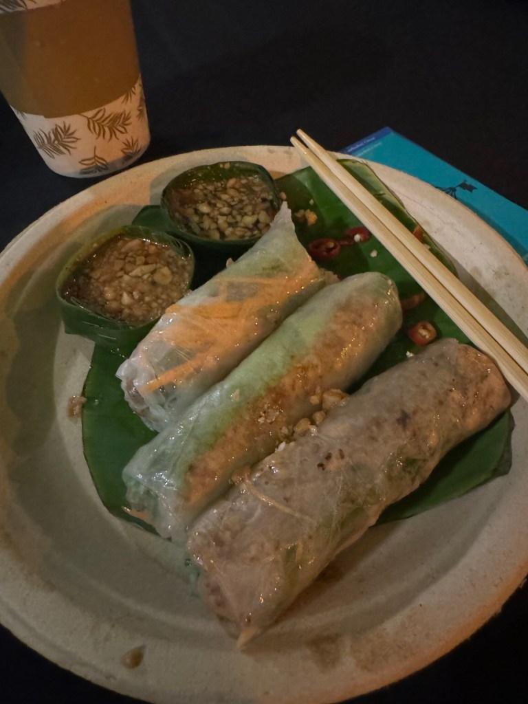 Ratha arranges our tuk tuk transport for this evening, and tonight we are in for a treat. We are going to the Phare Circus!! Phare is a contemporary circus troupe, whose performances blend traditional and modern circus arts. The show is created by these artists, using Cambodian history and folklore with current elements to cultivate the show. It began back in 1985, and was founded as a place for young war refugees to heal themselves and the community though art. They even have a Guiness World Record for longest circus performance! Before the show, we have dinner at the venue. We buy tickets/vouchers and then use those tickets to choose the food and drinks. I opt for these giant spring rolls.