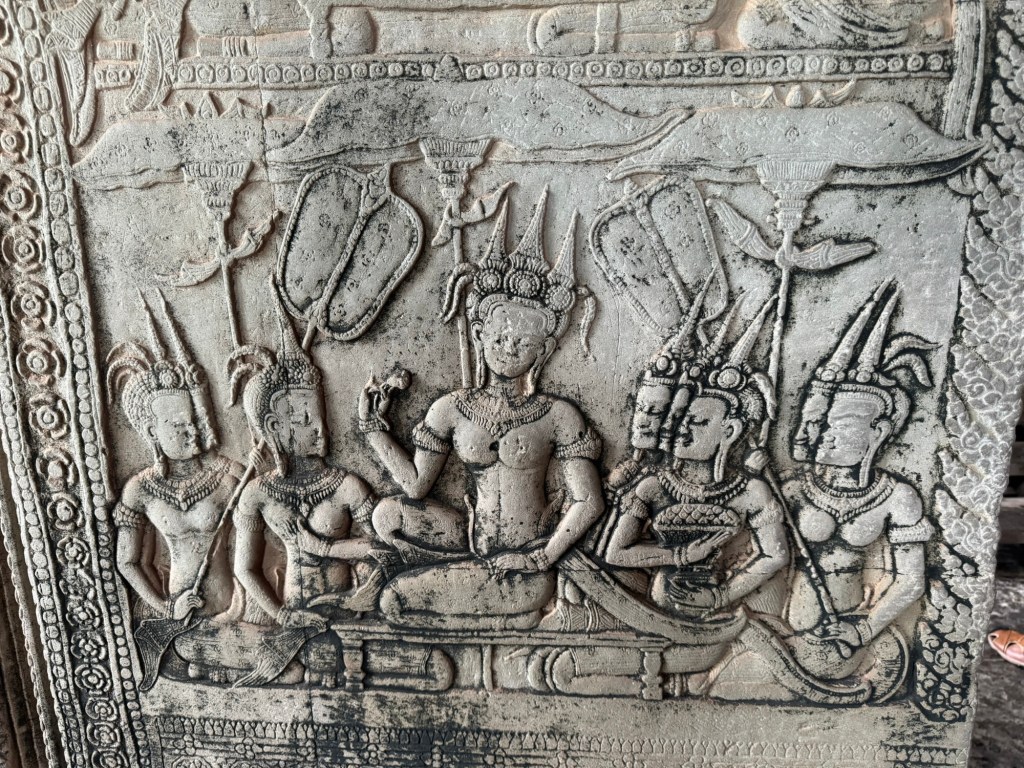 The walls are covered with intricate carvings that represent Hindu gods and ancient Khmer scenes, but were eventually replaced by Buddhist art.