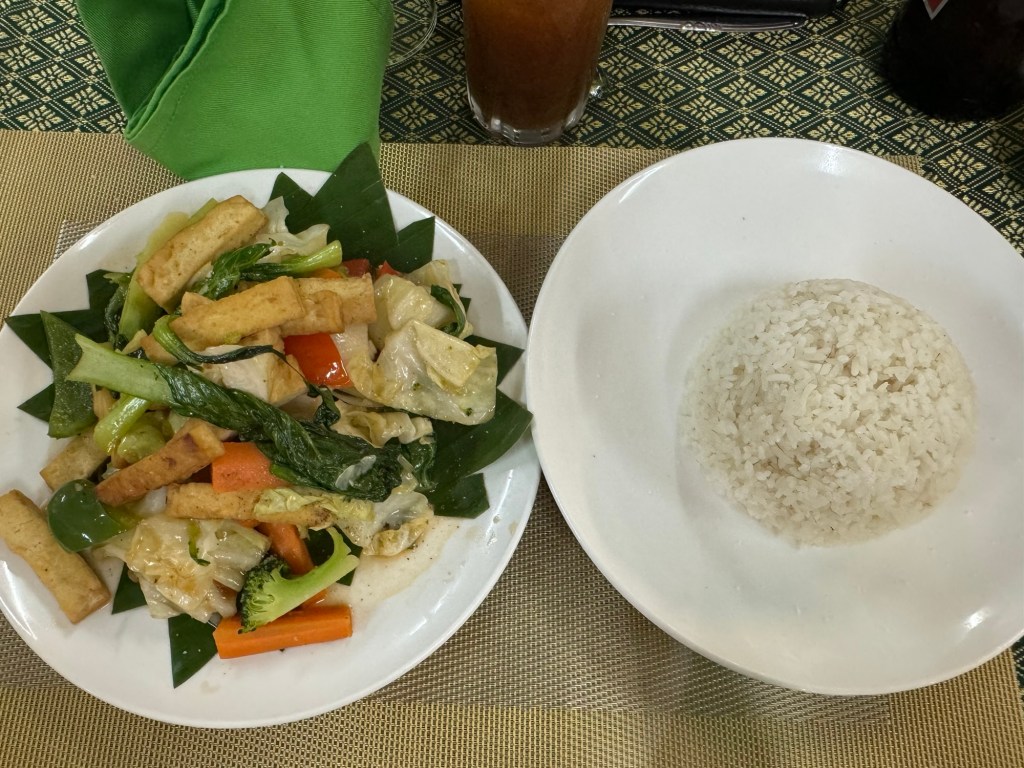 At this point, my body needs a break. We don’t stay here for too long, and now it’s time for lunch. We stop at a place near the temple complex called Khmer Village. I have stir fry veggies with tofu and a glass of refreshing tamarind juice.