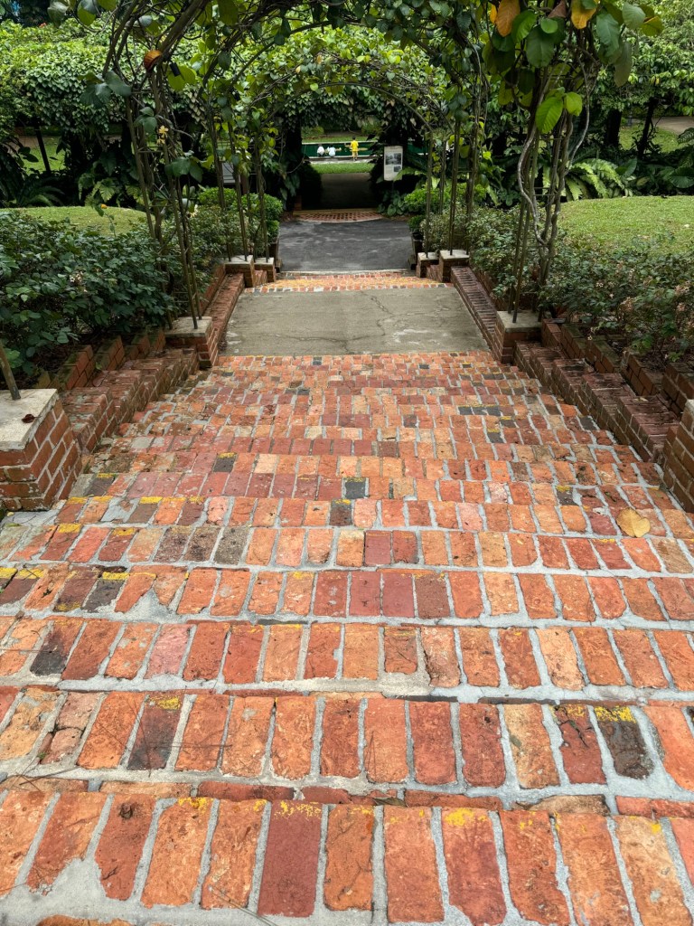 These are the prisoner of war brick steps, made during the Japanaese occupation of Singapore. As a sign of defiance, the prisoners imprinted arrows on the bricks to indicate they were being detained.