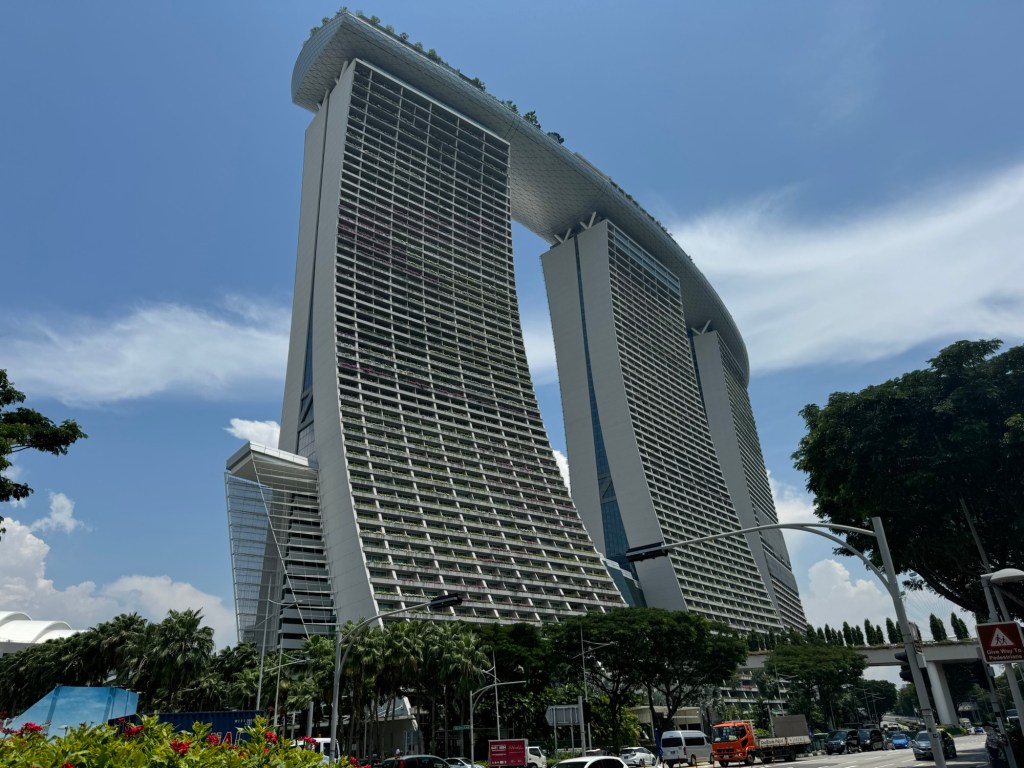 Marina Bay Sands is absolutely huge….I decide that I will not have time to attempt going inside so I admire it from the outside. It has a casino, giant convention centre, a luxury shopping mall, a science museum, a theatre, celebrity chef restauarants, and a Skypark connecting the towers. It looks like a big cruise ship; a big tropical park the size of 3 football fields!