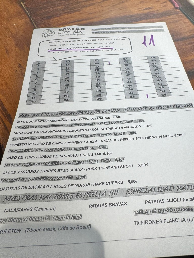 All of the pintxos are on display at the bar, and the server gives us an order paper.