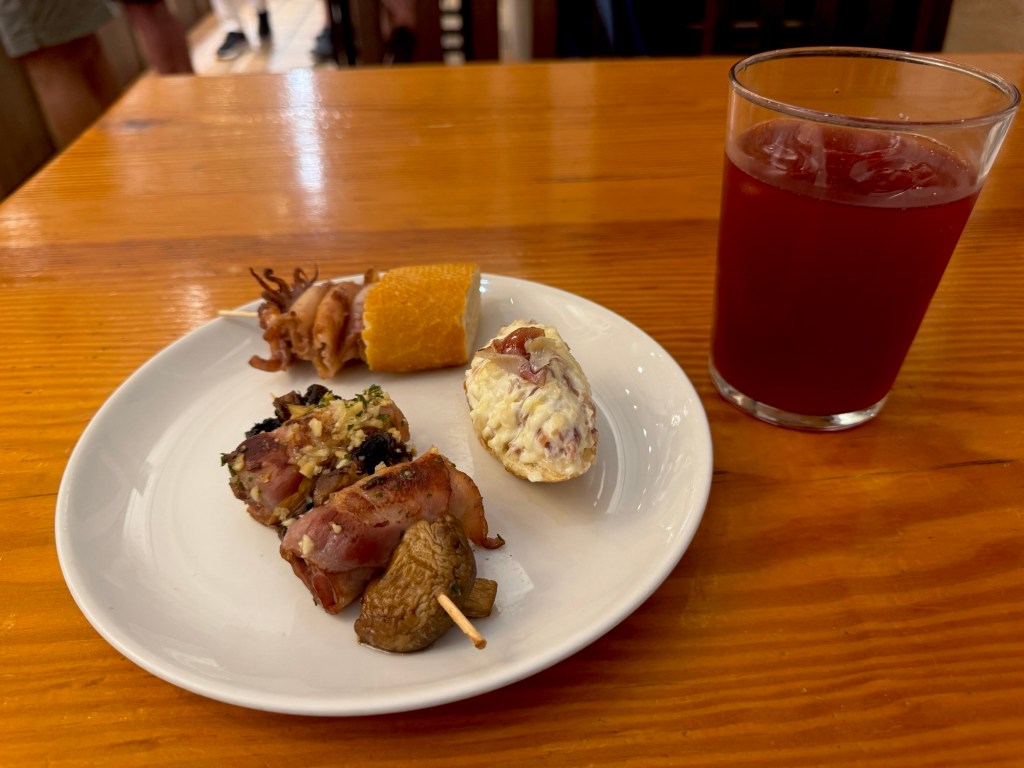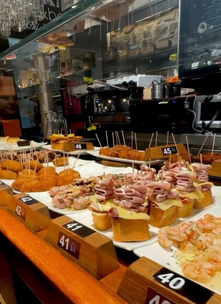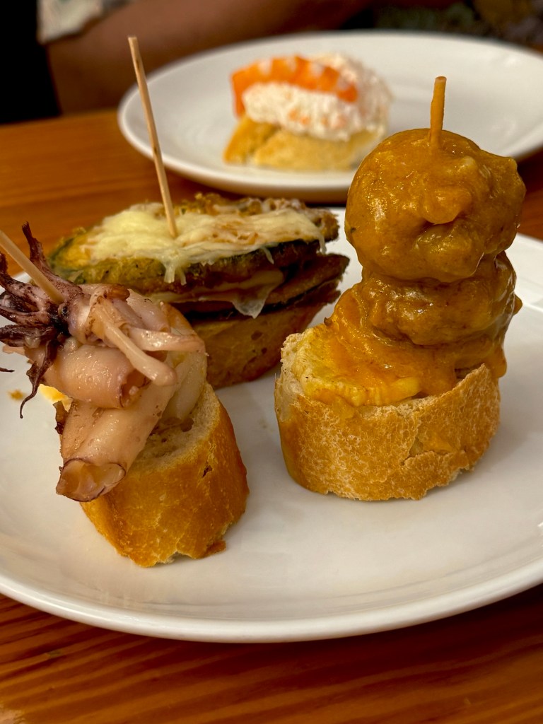 And I enjoy another glass of tinto de verano. I choose the bacon/sausage/mushroom skewer, the squid, and a creamy ham and cheese on bread. It’s a really fun experience!