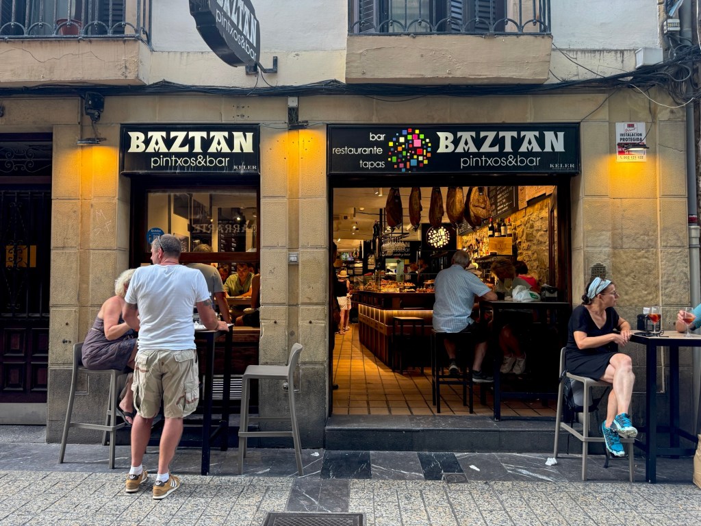 Now it’s time for dinner, and of course we will be having pintxos!! This is San Sebastian’s version of tapas, and it’s at the heart of the food culture here. It’s popular to do a pintxos food crawl, but we’re not sure where to go or what to order so we find one place and stick to it. It’s called Baztan.