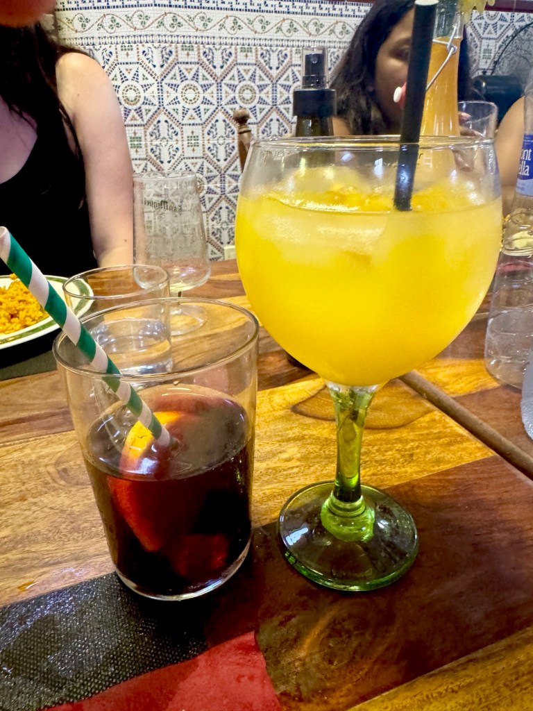 To drink we have Sangria, which is red wine mixed with additional spirits like brandy or flavored liqueurs and soaked with fresh fruit.