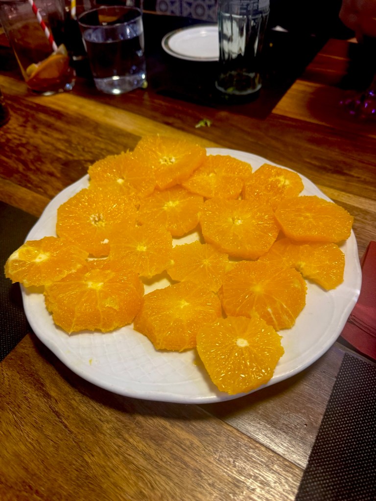 It’s yummy, but I suspect this one is also watered down, because after this and that sangria, I STILL don’t feel a buzz which makes zero sense to me. For dessert, we have Valencia oranges…what else would we have? Haha