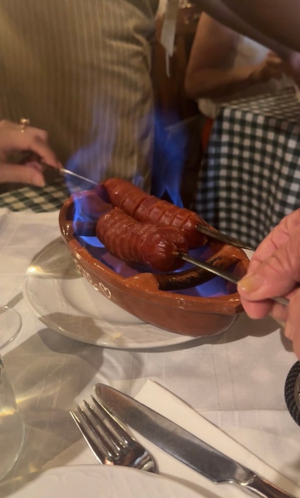 We start dinner with the famous flaming sausage – you spin that wiener around until it cooks all the way through.